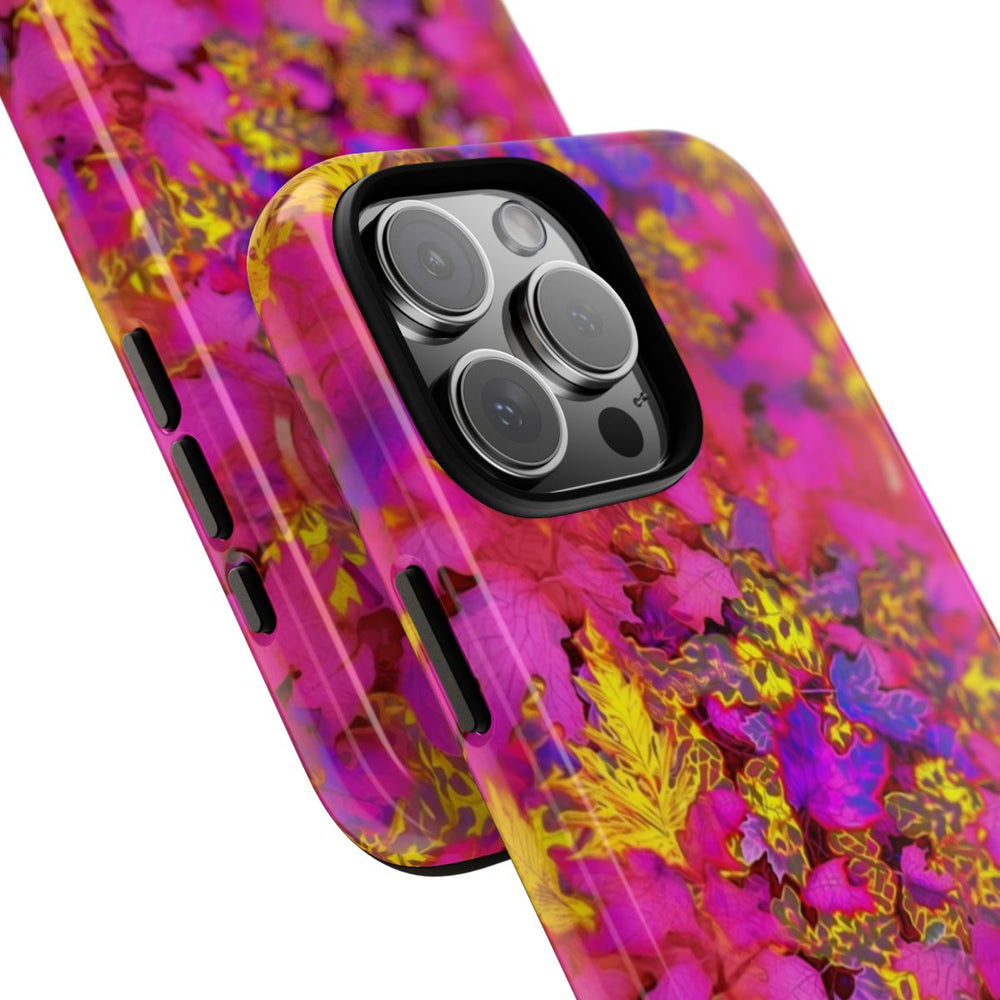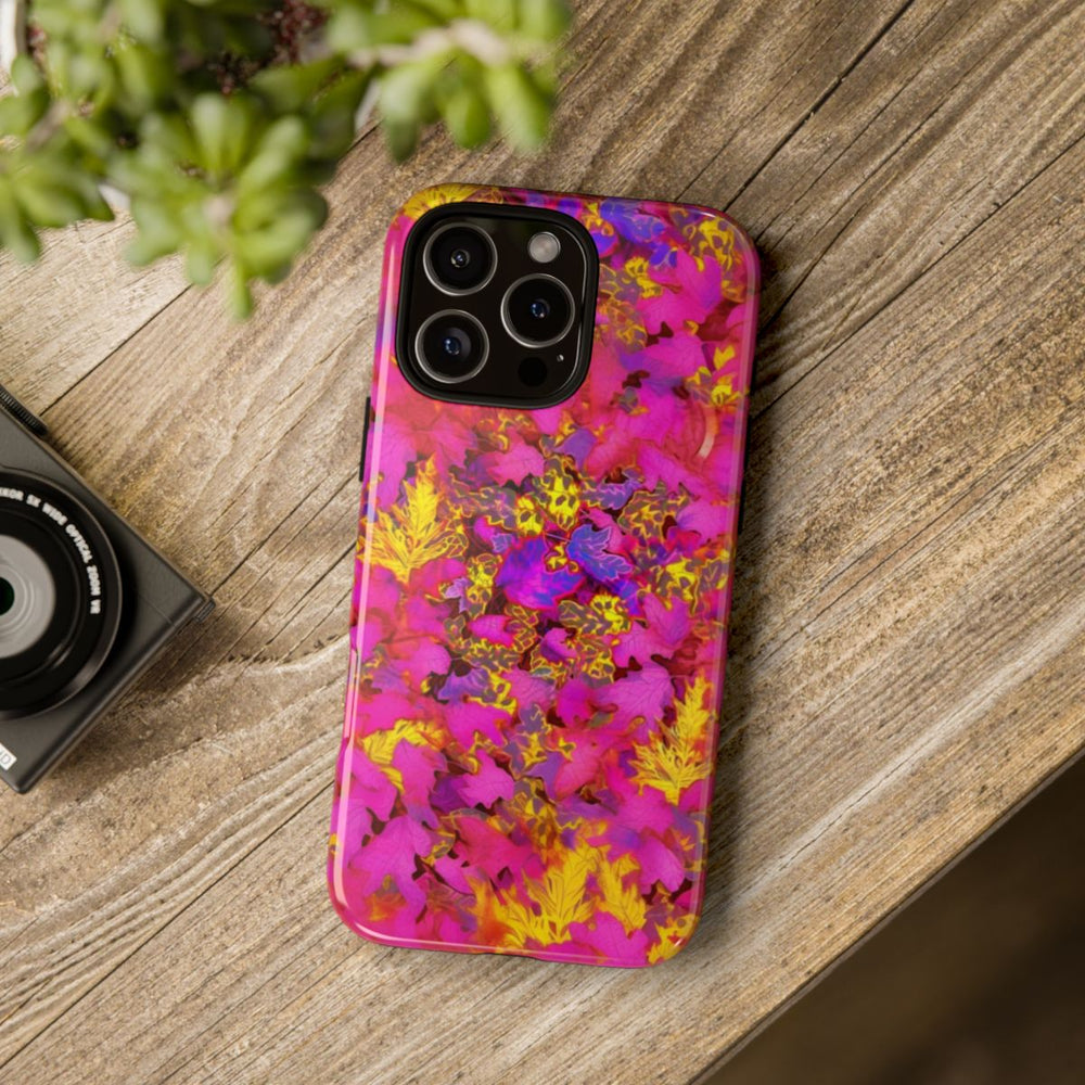Dit hoesje heeft een dicht patroon van bladeren in heldere roze en gele tinten, wat zorgt voor een opvallend en energiek effect. De bladeren overlappen elkaar en zijn subtiel aangevuld met paarse en magenta accenten, wat diepte en complexiteit aan het ontwerp geeft. Het patroon is naadloos en zeer gedetailleerd, waardoor het perfect past bij een glanzend, stevig hoesje. Dit hoesje bestaat uit twee lagen: een stevige polycarbonaat buitenkant en een TPU-binnenzijde. Zo biedt het extra bescherming en duurzaamheid, en ondersteunt het draadloos opladen.