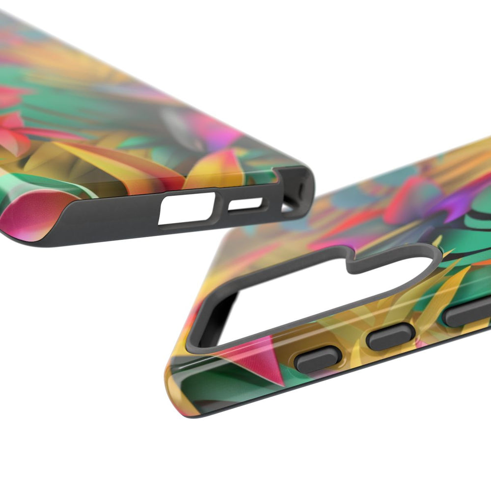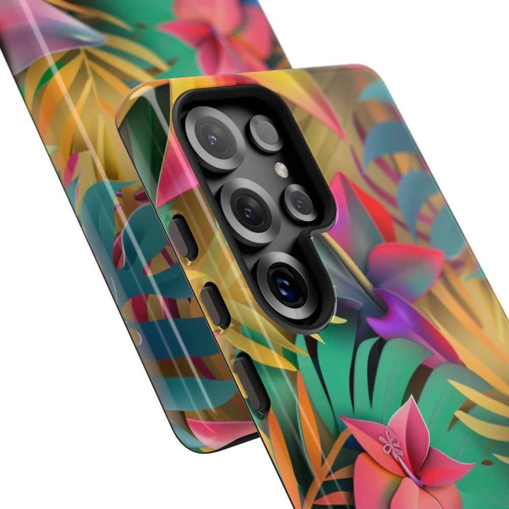 Dit hoesje heeft een opvallend tropisch bloemenpatroon met grote, kleurrijke bloemen en weelderige bladeren. De bloemen lopen over in heldere tinten roze, oranje, paars en rood, terwijl de bladeren verschillende groentinten, teal en geel bevatten. Het patroon heeft een driedimensionaal effect, waardoor diepte en textuur ontstaan. De afbeelding is gedrukt op een glanzend en stevig hoesje van polycarbonaat en TPU, met een dubbele laag voor extra stevigheid en bescherming. Het hoesje ondersteunt draadloos opladen en is bestand tegen invloeden van buitenaf.