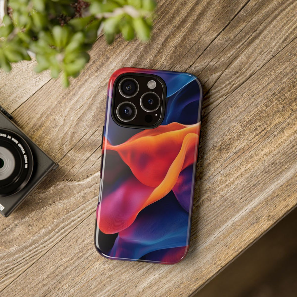 Dit hoesje is voorzien van een abstract ontwerp met vloeiende, golvende vormen en een gladde, subtiel gestructureerde uitstraling. De heldere kleuren lopen naadloos in elkaar over en tonen diepe tinten rood, oranje, paars en blauw. Fijne lijnen geven het geheel extra diepte en beweging, wat zorgt voor een dynamisch en modern effect. De afbeelding is bedrukt op een glanzend, stevig hoesje met een dubbele laag van polycarbonaat en TPU. Het hoesje ondersteunt draadloos opladen en is bestand tegen invloeden van buitenaf.