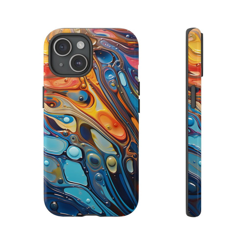 Dit hoesje heeft een opvallend abstract ontwerp dat doet denken aan golven op vloeistof, met een glanzende, glasachtige uitstraling. De afbeelding bestaat uit vloeiende vormen en soepele lijnen in een dynamische mix van kleuren zoals fel oranje, geel, blauw en subtiel bruin. Kleine afgeronde druppels verspreid over het oppervlak versterken het vloeistofeffect. Het hoesje bestaat uit twee lagen: een stevige polycarbonaat buitenkant en een TPU binnenzijde. Dit zorgt voor extra duurzaamheid en bescherming, ook buitenshuis. Geschikt voor draadloos opladen.