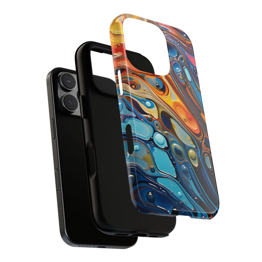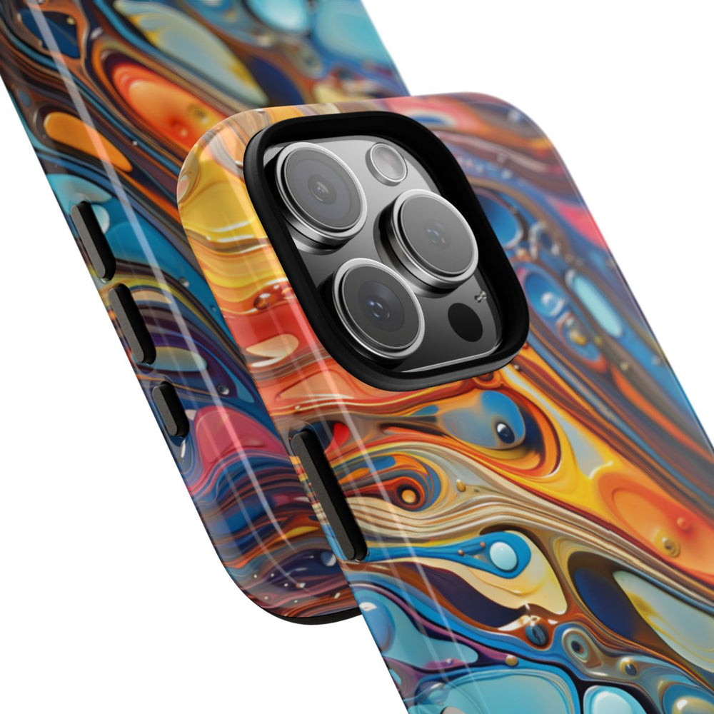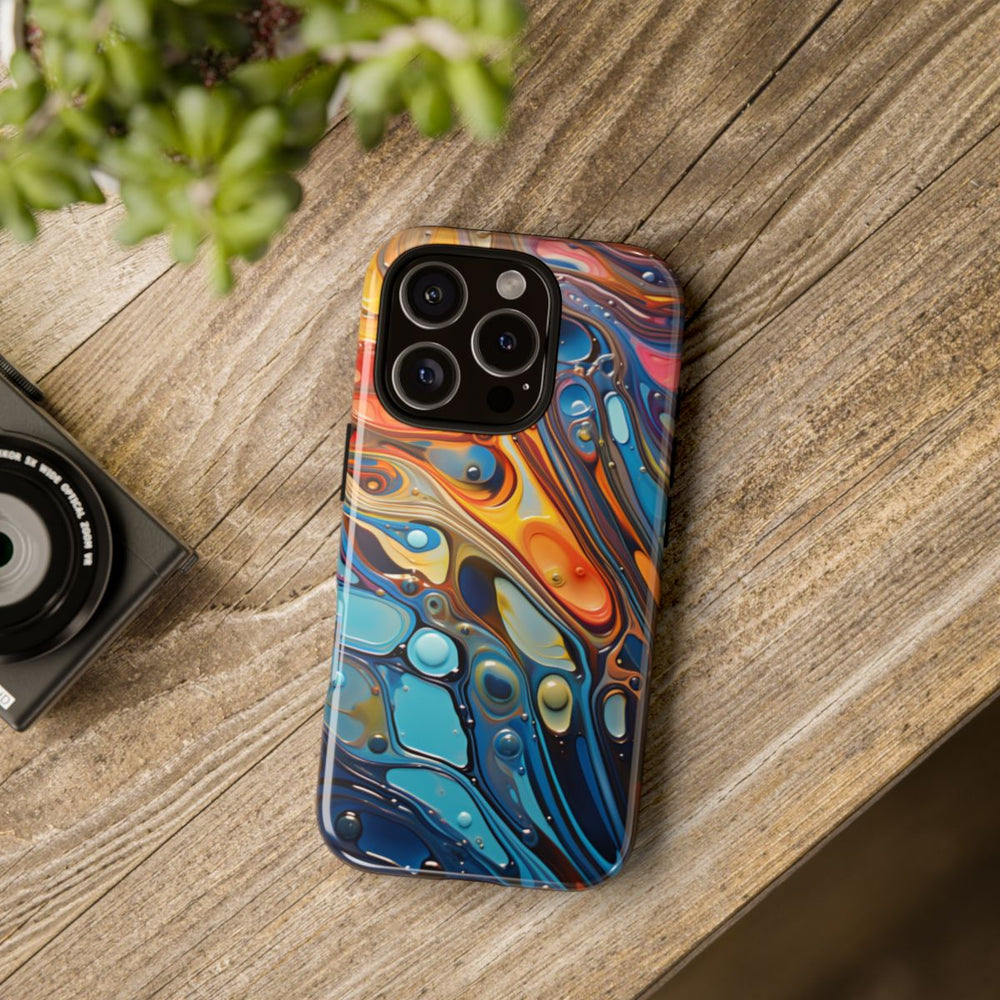 Dit hoesje heeft een opvallend abstract ontwerp dat doet denken aan golven op vloeistof, met een glanzende, glasachtige uitstraling. De afbeelding bestaat uit vloeiende vormen en soepele lijnen in een dynamische mix van kleuren zoals fel oranje, geel, blauw en subtiel bruin. Kleine afgeronde druppels verspreid over het oppervlak versterken het vloeistofeffect. Het hoesje bestaat uit twee lagen: een stevige polycarbonaat buitenkant en een TPU binnenzijde. Dit zorgt voor extra duurzaamheid en bescherming, ook buitenshuis. Geschikt voor draadloos opladen.