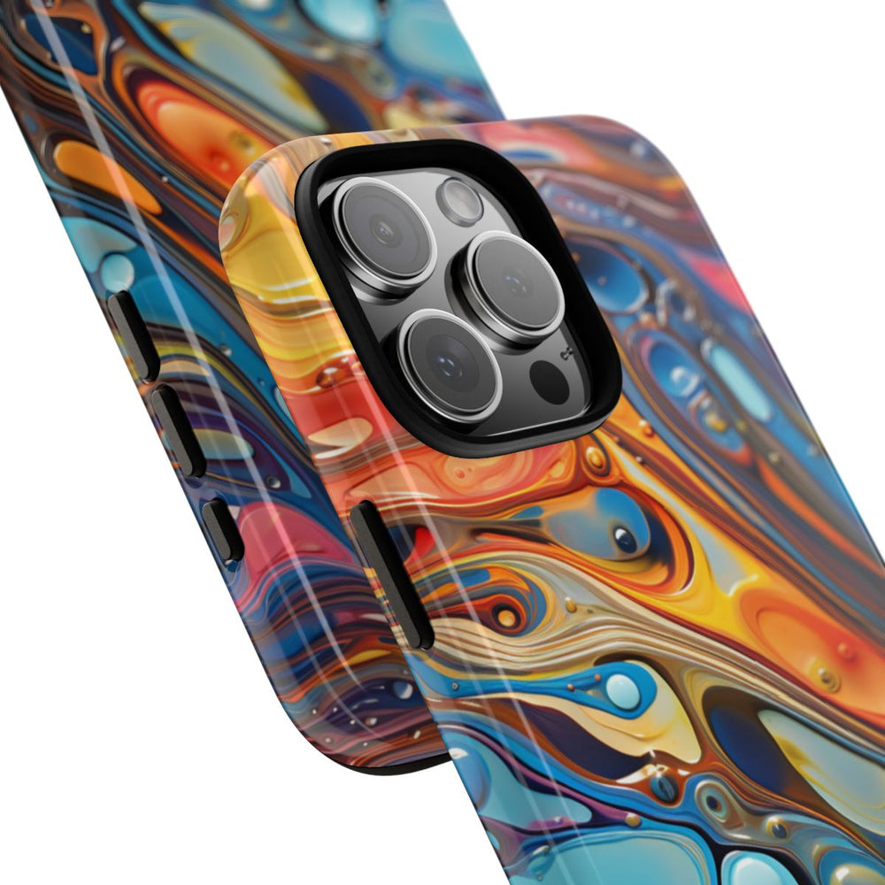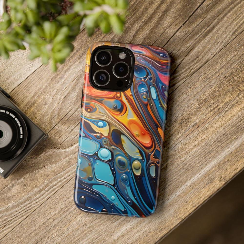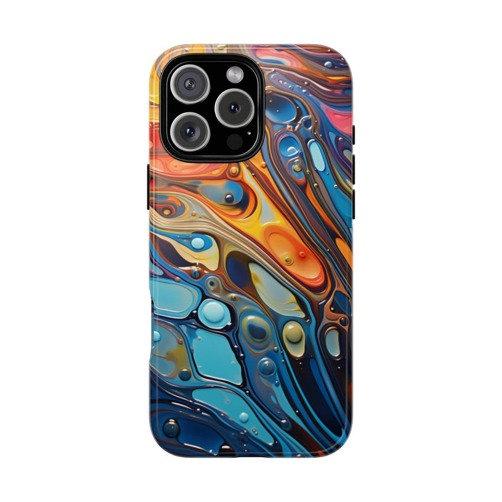 Dit hoesje heeft een opvallend abstract ontwerp dat doet denken aan golven op vloeistof, met een glanzende, glasachtige uitstraling. De afbeelding bestaat uit vloeiende vormen en soepele lijnen in een dynamische mix van kleuren zoals fel oranje, geel, blauw en subtiel bruin. Kleine afgeronde druppels verspreid over het oppervlak versterken het vloeistofeffect. Het hoesje bestaat uit twee lagen: een stevige polycarbonaat buitenkant en een TPU binnenzijde. Dit zorgt voor extra duurzaamheid en bescherming, ook buitenshuis. Geschikt voor draadloos opladen.