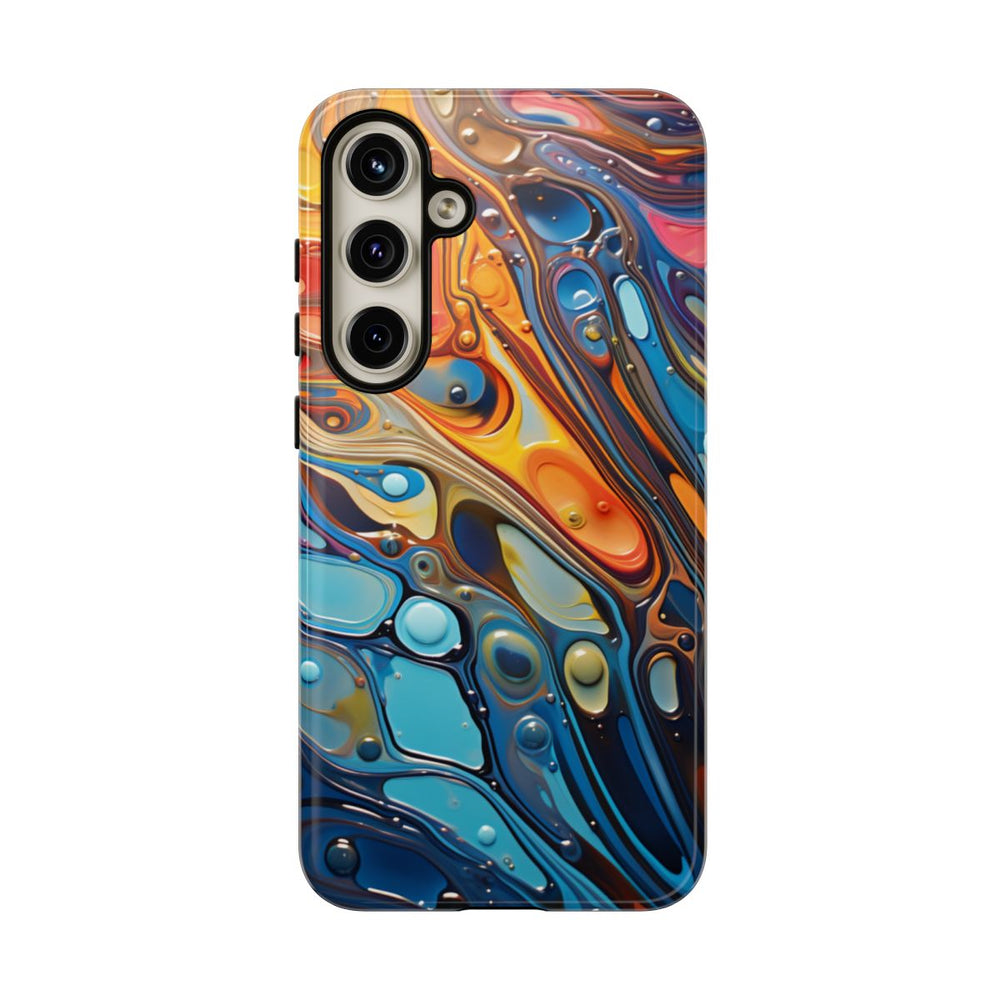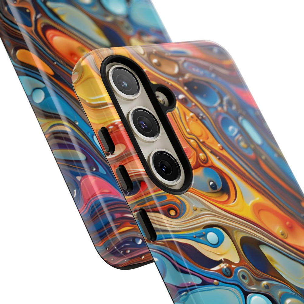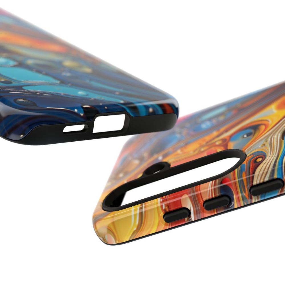 Dit hoesje heeft een opvallend abstract ontwerp dat doet denken aan golven op vloeistof, met een glanzende, glasachtige uitstraling. De afbeelding bestaat uit vloeiende vormen en soepele lijnen in een dynamische mix van kleuren zoals fel oranje, geel, blauw en subtiel bruin. Kleine afgeronde druppels verspreid over het oppervlak versterken het vloeistofeffect. Het hoesje bestaat uit twee lagen: een stevige polycarbonaat buitenkant en een TPU binnenzijde. Dit zorgt voor extra duurzaamheid en bescherming, ook buitenshuis. Geschikt voor draadloos opladen.