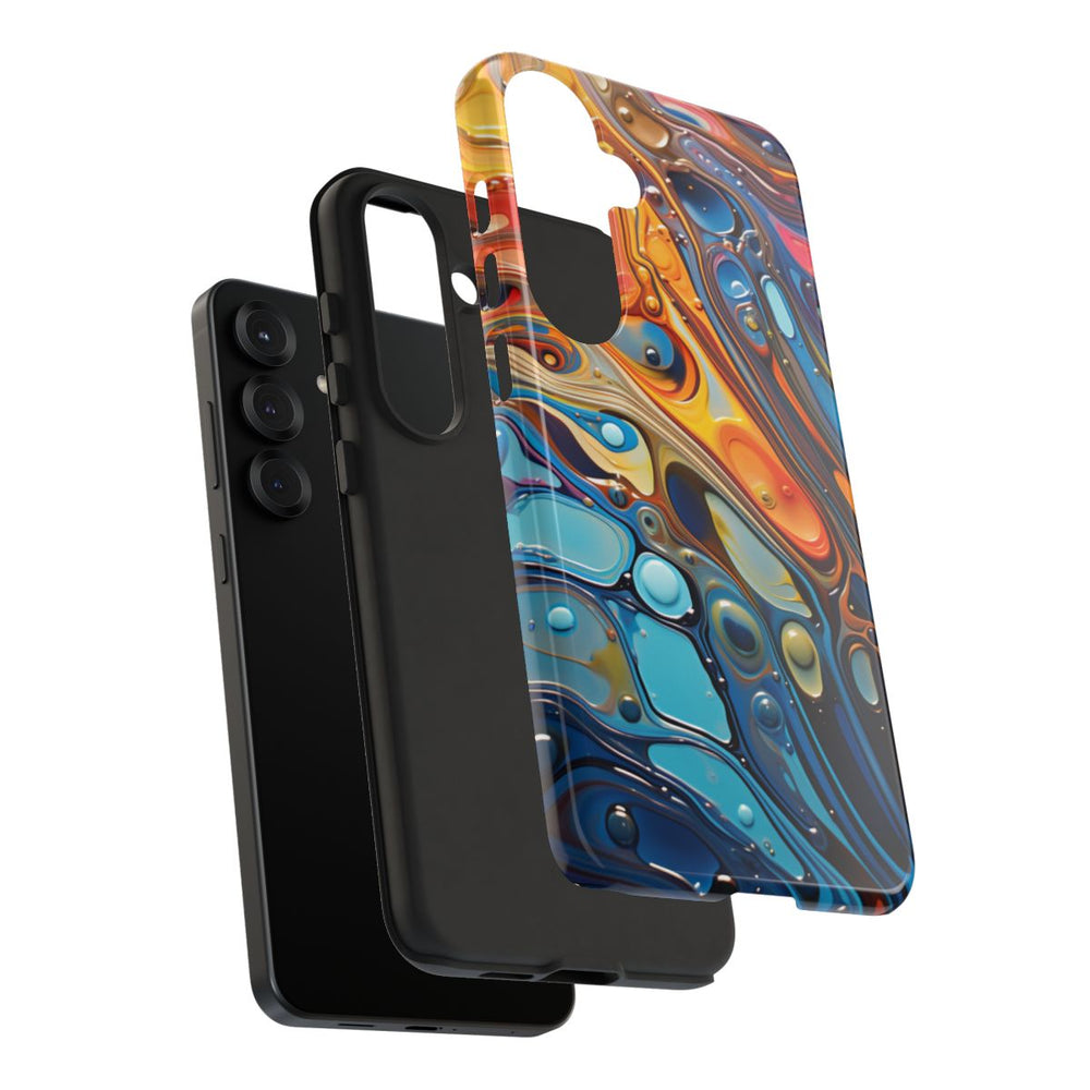 Dit hoesje heeft een opvallend abstract ontwerp dat doet denken aan golven op vloeistof, met een glanzende, glasachtige uitstraling. De afbeelding bestaat uit vloeiende vormen en soepele lijnen in een dynamische mix van kleuren zoals fel oranje, geel, blauw en subtiel bruin. Kleine afgeronde druppels verspreid over het oppervlak versterken het vloeistofeffect. Het hoesje bestaat uit twee lagen: een stevige polycarbonaat buitenkant en een TPU binnenzijde. Dit zorgt voor extra duurzaamheid en bescherming, ook buitenshuis. Geschikt voor draadloos opladen.