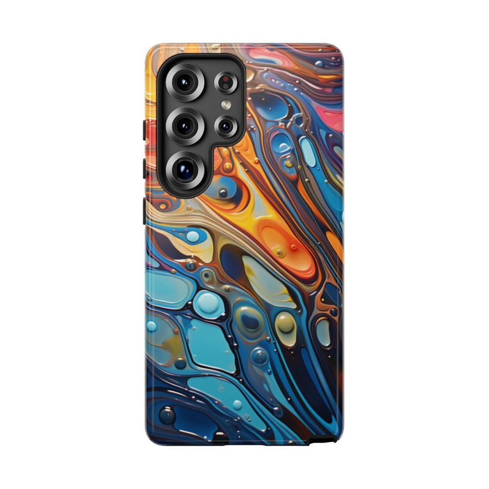 Dit hoesje heeft een opvallend abstract ontwerp dat doet denken aan golven op vloeistof, met een glanzende, glasachtige uitstraling. De afbeelding bestaat uit vloeiende vormen en soepele lijnen in een dynamische mix van kleuren zoals fel oranje, geel, blauw en subtiel bruin. Kleine afgeronde druppels verspreid over het oppervlak versterken het vloeistofeffect. Het hoesje bestaat uit twee lagen: een stevige polycarbonaat buitenkant en een TPU binnenzijde. Dit zorgt voor extra duurzaamheid en bescherming, ook buitenshuis. Geschikt voor draadloos opladen.