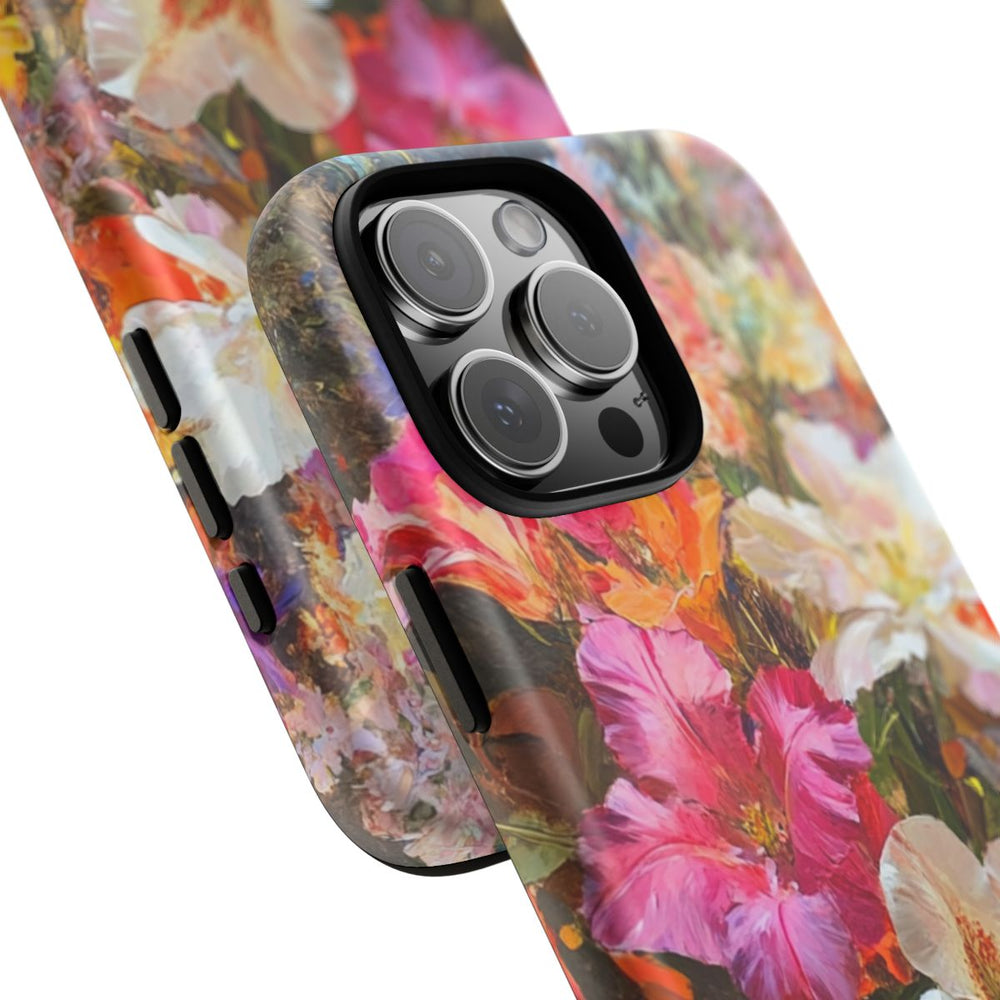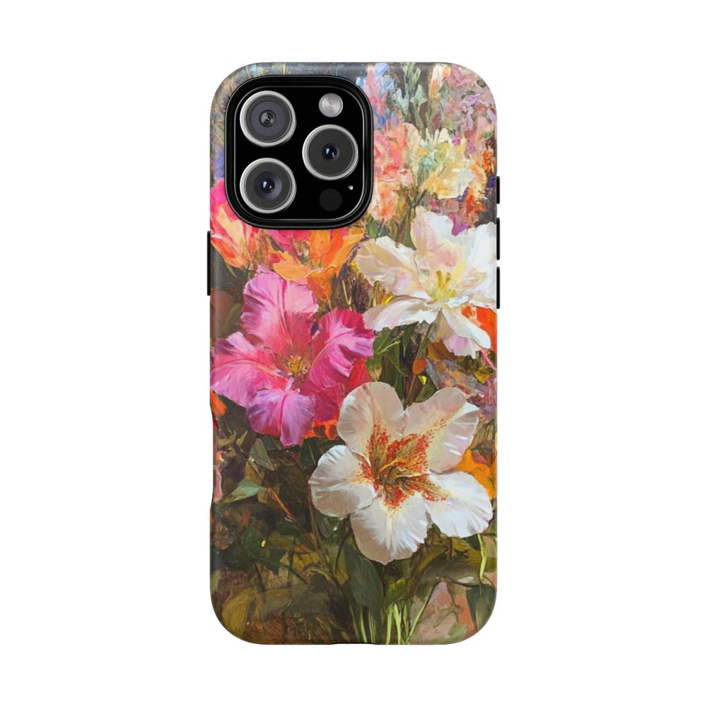 Dit hoesje is voorzien van een gedetailleerde schildering van een levendig bloemenboeket met diverse bloemen in roze, wit, oranje en paars. De bloemen komen mooi tot hun recht tegen een donkere, getextureerde achtergrond, waardoor de heldere kleuren van de bloemblaadjes en groene bladeren extra opvallen. Het matte hoesje is stevig uitgevoerd met een buitenkant van polycarbonaat en een binnenzijde van TPU, wat zorgt voor dubbele bescherming. Daarnaast ondersteunt het hoesje draadloos opladen.