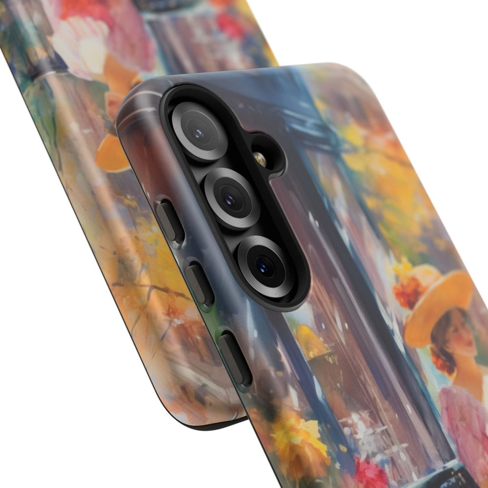 Dit hoesje toont een prachtige aquarel van een vrouw die buiten een sfeervol café zit, omringd door kleurrijke bloemen. Ze draagt een grote hoed en een zwierige rode jurk, wat zorgt voor een levendige en uitnodigende uitstraling. Op de achtergrond zie je een heldere, zonnige dag met groene accenten en sprankelende kleuren. Het hoesje heeft een dubbele laag voor extra bescherming en is geschikt voor draadloos opladen. Ideaal voor liefhebbers van kunst en natuur.