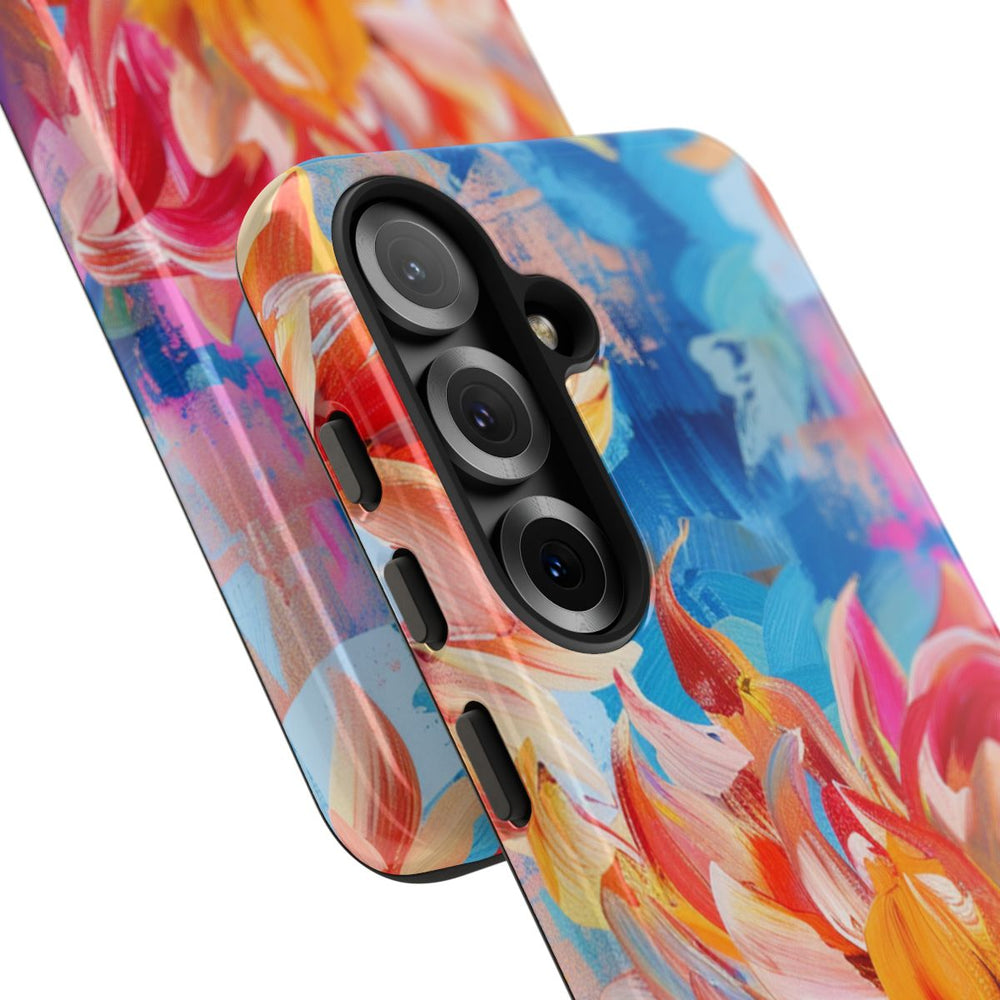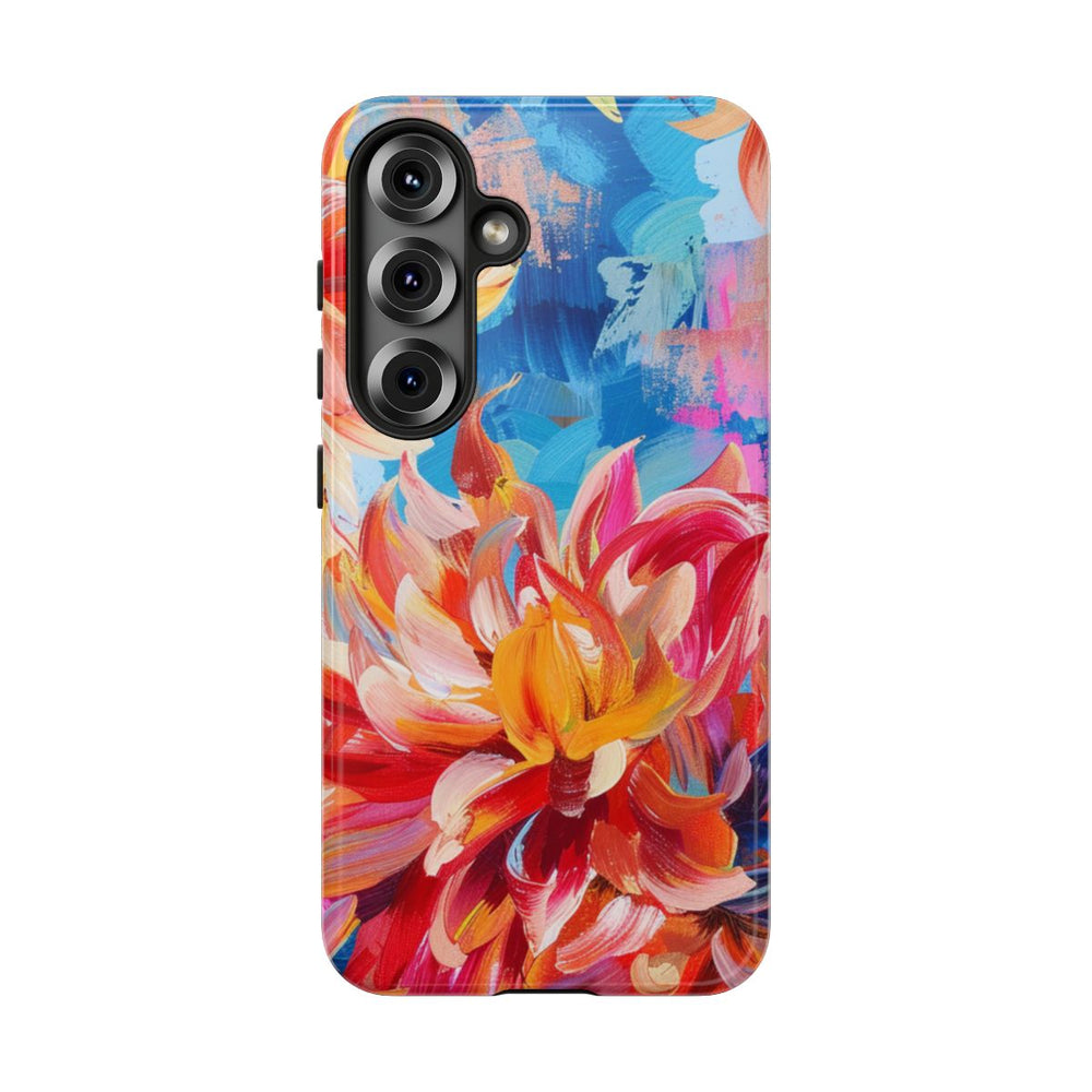 Dit hoesje is versierd met grote, opvallende dahliabloemen in rood, oranje, roze en paars. De bloemblaadjes zijn geschilderd met zichtbare penseelstreken, wat zorgt voor een textuur die doet denken aan oliepastel. De achtergrond bestaat uit verschillende blauwtinten met abstracte penseelstreken en spatten in roze en perzik, wat samen een dynamisch en kleurrijk geheel vormt. Het hoesje heeft een glanzende afwerking en is stevig uitgevoerd met een dubbele laag voor extra duurzaamheid en bescherming. Geschikt voor draadloos opladen.