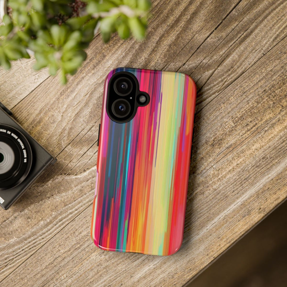 Dit hoesje heeft een opvallend patroon van verticale, kleurrijke strepen in tinten zoals roze, rood, blauw, paars, oranje en geel. De strepen hebben een glitch-achtig, gepixeld effect met zichtbare digitale vervormingen en fijne details. Het abstracte ontwerp loopt naadloos door en zorgt voor een dynamische, energieke uitstraling. Het hoesje is glanzend en extra stevig dankzij de dubbele laag van een polycarbonaat buitenkant en een TPU-binnenzijde. Zo biedt het optimale bescherming én is het geschikt voor draadloos opladen.