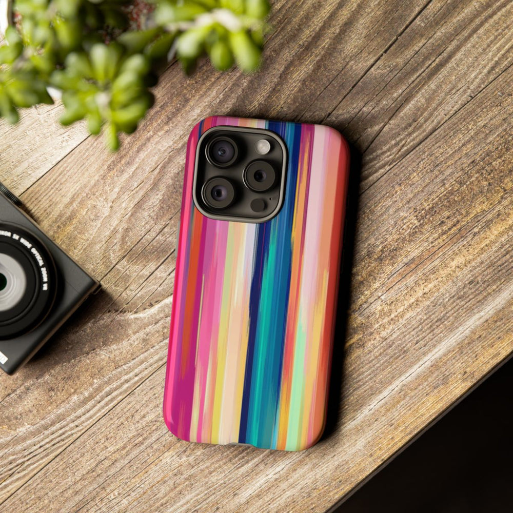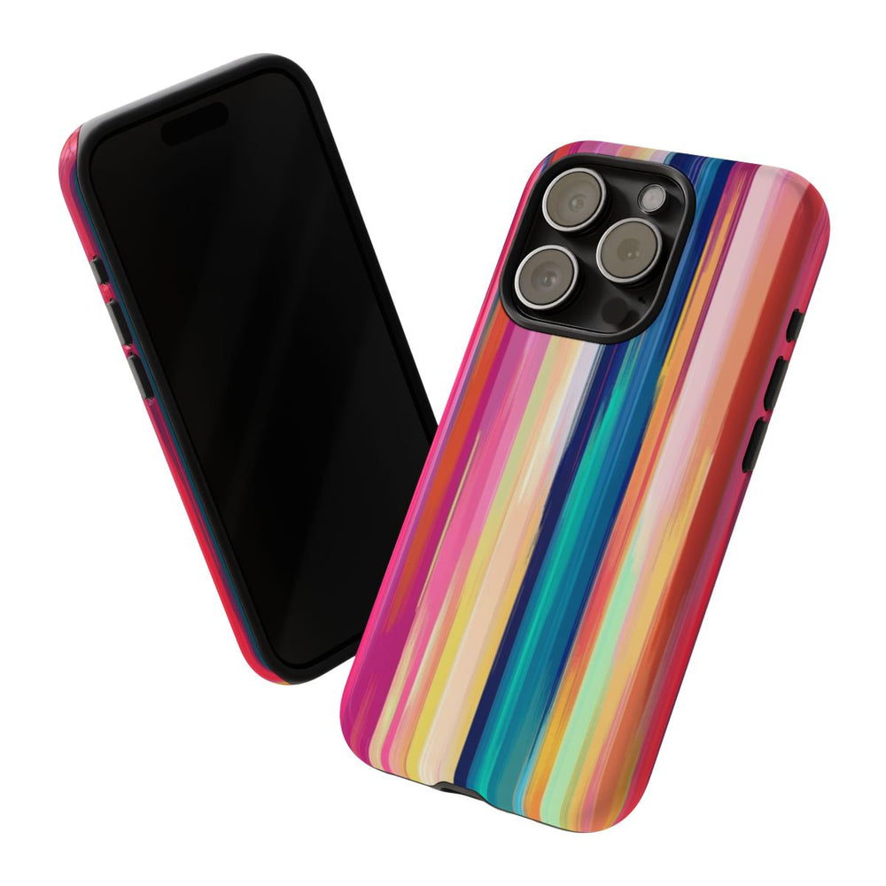 Dit hoesje heeft een naadloos patroon van verticale strepen in een opvallend kleurenpalet. De strepen verschillen in breedte en lopen subtiel in elkaar over met een schilderachtig, getextureerd effect. De felle kleuren, zoals roze, blauw, rood, geel en groen, zorgen samen met subtiele kleurverlopen en digitale vervormingen voor een dynamische uitstraling. Het hoesje bestaat uit twee lagen van polycarbonaat en TPU, waardoor het stevig is en geschikt voor draadloos opladen.