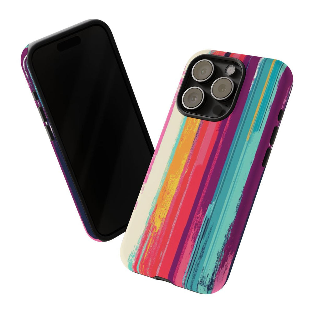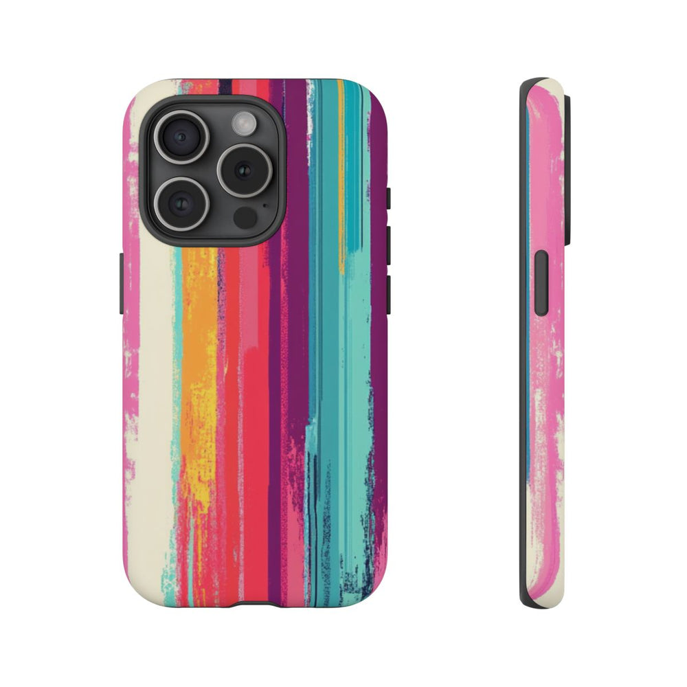 Dit hoesje is bedrukt met een naadloos patroon van verticale, kleurrijke strepen met een geschilderd en licht verweerd effect. De strepen verschillen in breedte en tonen levendige tinten zoals roze, geel, turquoise, paars, oranje en wit. Het ontwerp heeft een abstracte, artistieke uitstraling met zichtbare penseelstreken en een subtiel ruwe afwerking. Het matte hoesje is gemaakt van een stevige polycarbonaat buitenkant en een TPU binnenzijde voor extra bescherming en duurzaamheid, en ondersteunt draadloos opladen.