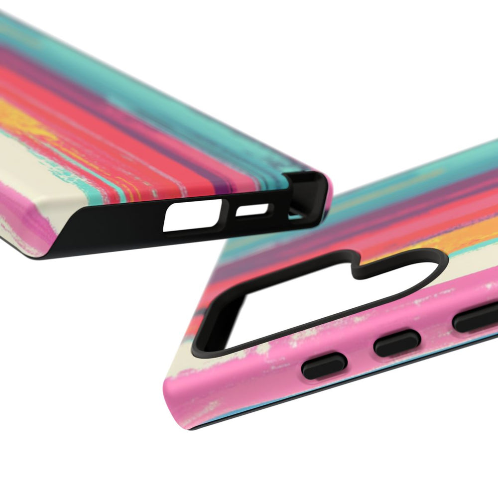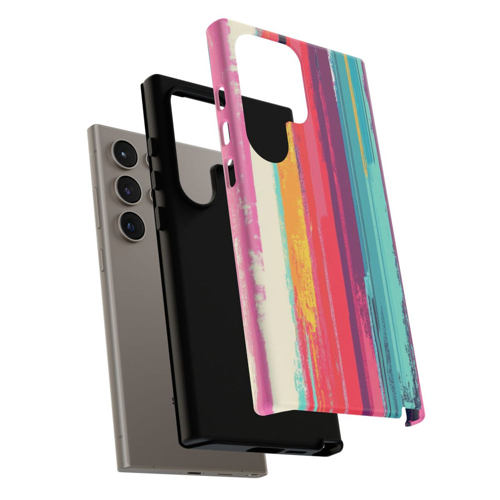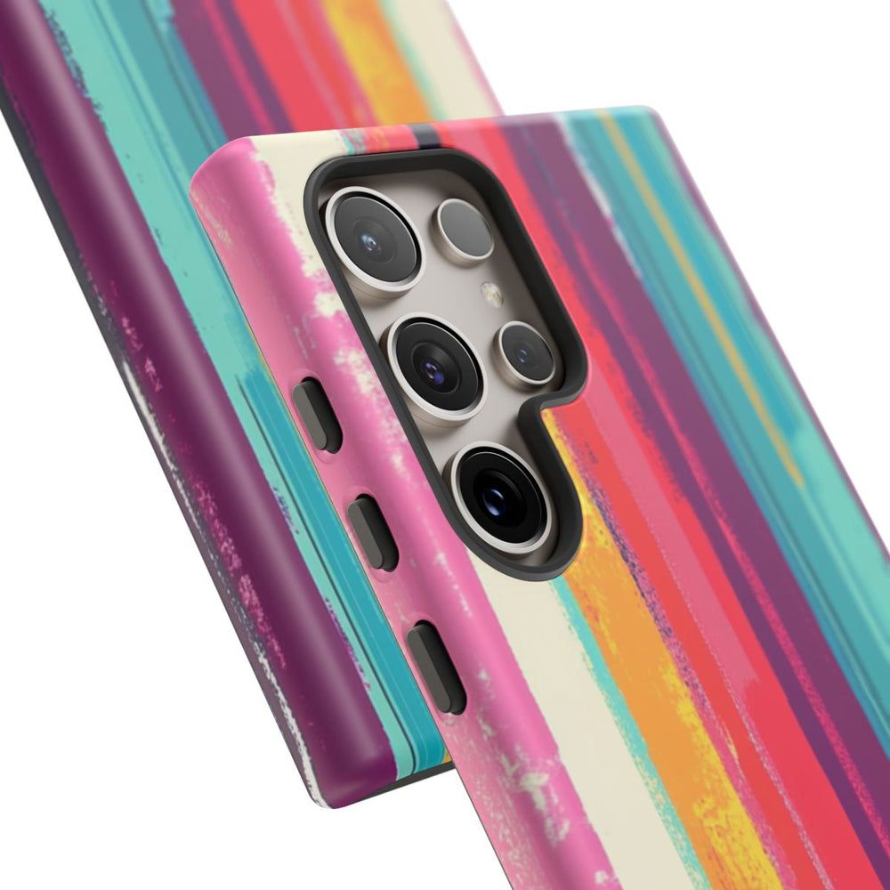 Dit hoesje is bedrukt met een naadloos patroon van verticale, kleurrijke strepen met een geschilderd en licht verweerd effect. De strepen verschillen in breedte en tonen levendige tinten zoals roze, geel, turquoise, paars, oranje en wit. Het ontwerp heeft een abstracte, artistieke uitstraling met zichtbare penseelstreken en een subtiel ruwe afwerking. Het matte hoesje is gemaakt van een stevige polycarbonaat buitenkant en een TPU binnenzijde voor extra bescherming en duurzaamheid, en ondersteunt draadloos opladen.