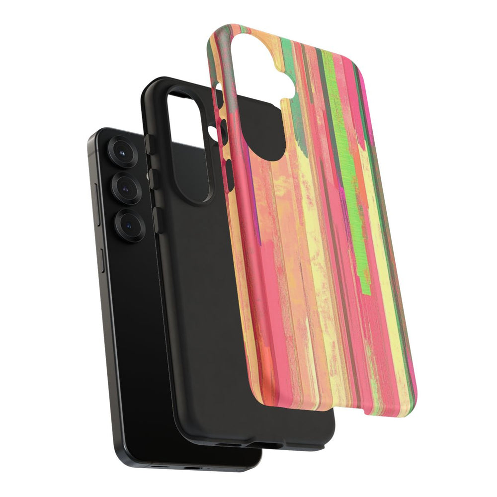 Dit ontwerp toont verticale strepen in een levendig kleurenpalet met tinten roze, koraal, neongroen en beige. Het patroon heeft een geschilderd effect met zichtbare penseelstreken en subtiele digitale vervormingen. De felle kleuren zorgen voor een energieke, abstracte uitstraling. Het ontwerp is bedrukt op een mat telefoonhoesje met een stevige dubbele laag voor extra duurzaamheid en bescherming, geschikt voor draadloos opladen.
