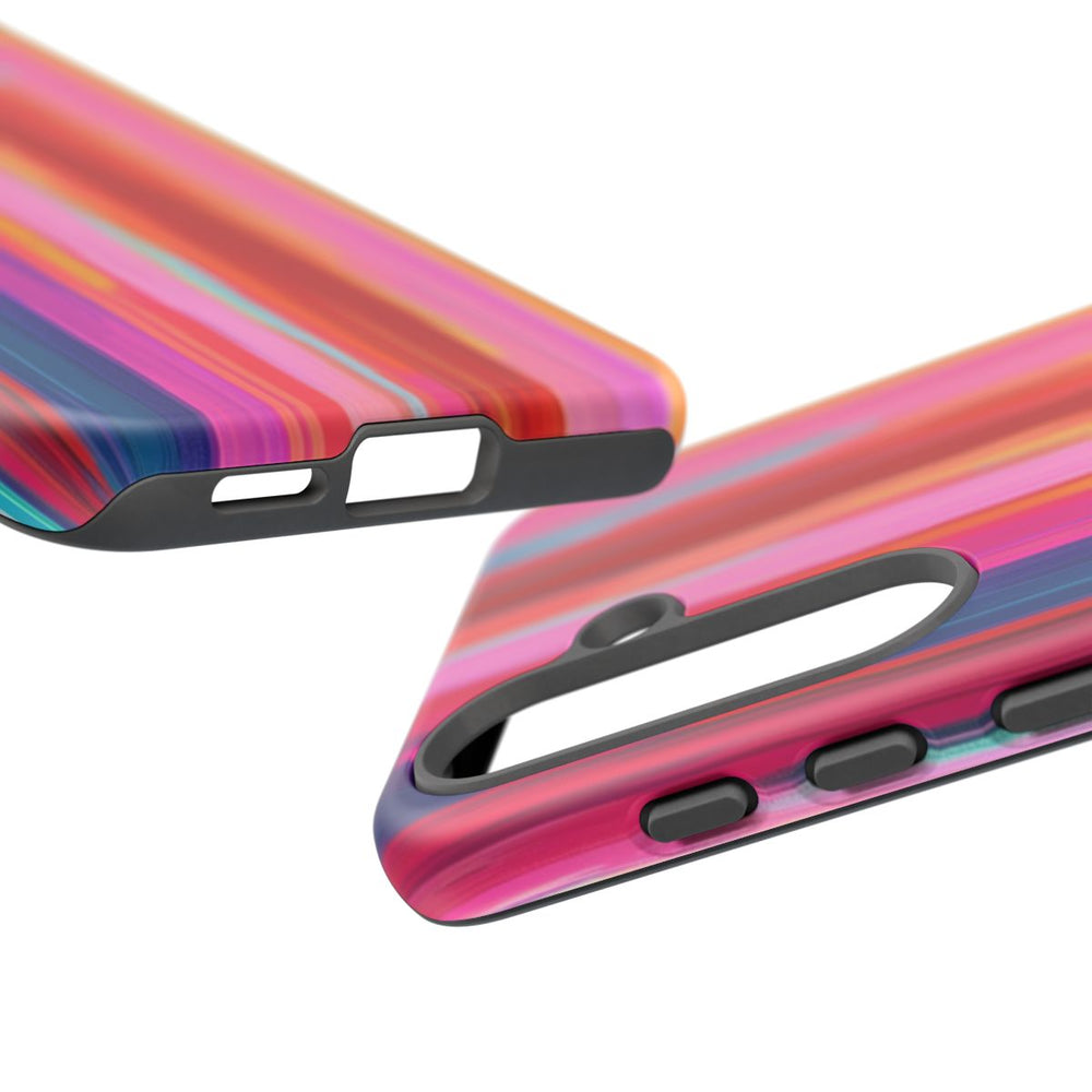Dit hoesje heeft een naadloos patroon van verticale, kleurrijke strepen met een digitaal glitch-effect. De strepen verschillen in breedte en zijn uitgevoerd in heldere en opvallende kleuren zoals roze, rood, oranje, blauw, paars en turquoise. Het abstracte ontwerp heeft een kunstzinnige uitstraling met zichtbare pixelstructuur en digitale vervorming. Het matte hoesje bestaat uit twee lagen: een stevige polycarbonaat buitenkant en een TPU binnenzijde, voor extra stevigheid en bescherming. Geschikt voor draadloos opladen.