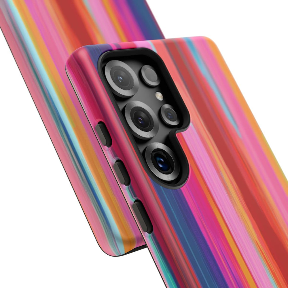 Dit hoesje heeft een naadloos patroon van verticale, kleurrijke strepen met een digitaal glitch-effect. De strepen verschillen in breedte en zijn uitgevoerd in heldere en opvallende kleuren zoals roze, rood, oranje, blauw, paars en turquoise. Het abstracte ontwerp heeft een kunstzinnige uitstraling met zichtbare pixelstructuur en digitale vervorming. Het matte hoesje bestaat uit twee lagen: een stevige polycarbonaat buitenkant en een TPU binnenzijde, voor extra stevigheid en bescherming. Geschikt voor draadloos opladen.