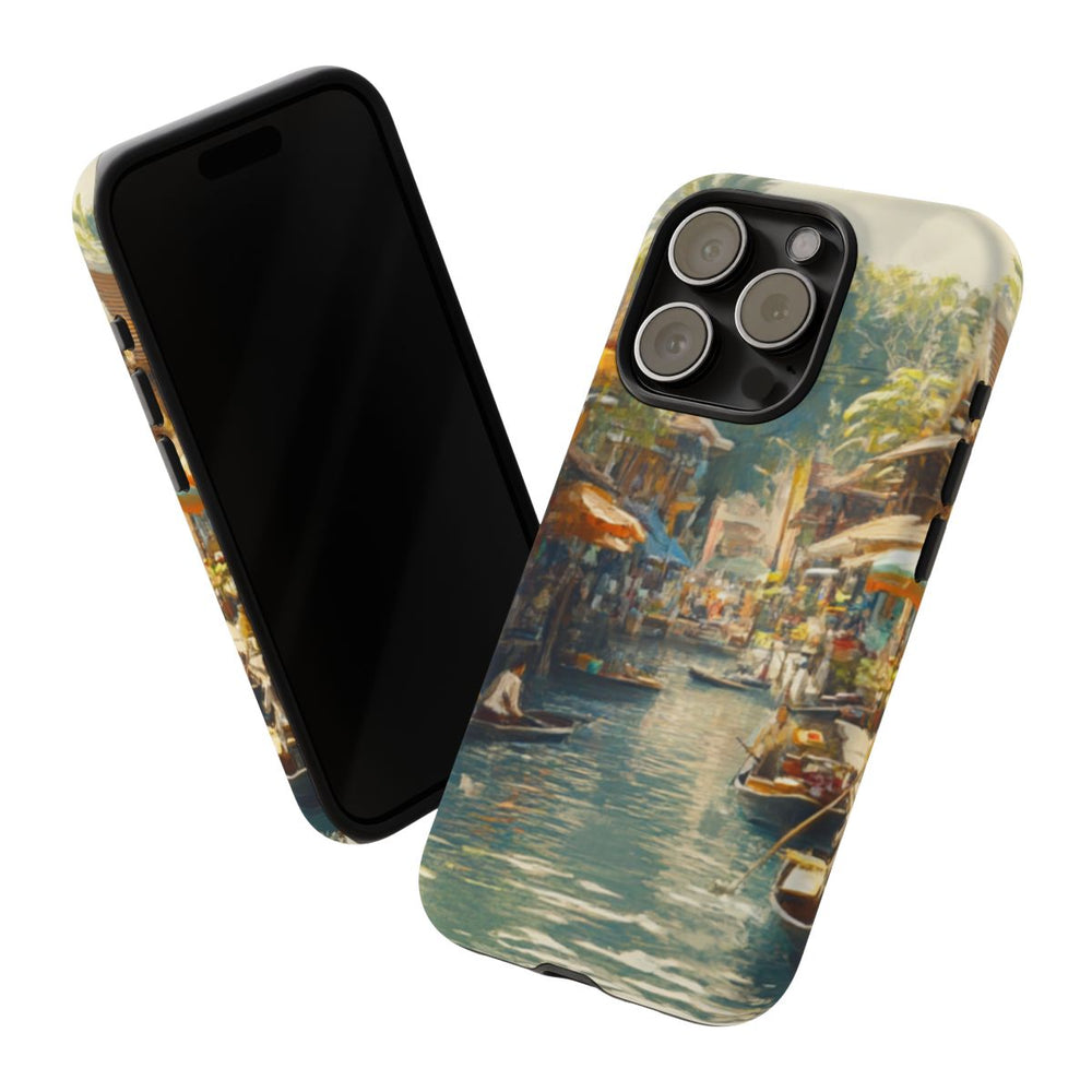 Dit telefoonhoesje toont een kleurrijke watermarkt met houten kraampjes en boten die rustig over een kanaal drijven. Op de achtergrond zijn weelderige groene bomen en palmbomen te zien. De marktkraampjes hebben opvallende zonneschermen in oranje- en beigetinten en bieden een gevarieerd aanbod aan producten. Mensen varen met boten en wandelen over houten loopbruggen. Het hoesje heeft een dubbele laag en een matte afwerking, is gemaakt van polycarbonaat en TPU voor extra bescherming, en ondersteunt draadloos opladen.