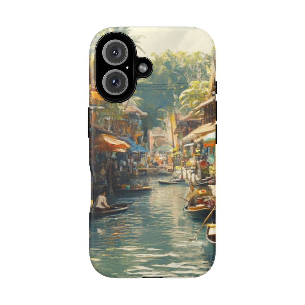 Dit hoesje toont een kleurrijke watermarkt met houten kraampjes en boten die drijven op een smalle gracht. De scène is gevuld met levendige kleuren van marktwaren en parasols die de kraampjes beschutten. Bomen en tropische planten omringen het geheel, terwijl zonlicht door de bladeren schijnt. Het hoesje heeft een matte afwerking en bestaat uit twee lagen van polycarbonaat en TPU, wat zorgt voor extra stevigheid en bescherming tegen invloeden van buitenaf. Geschikt voor draadloos opladen.