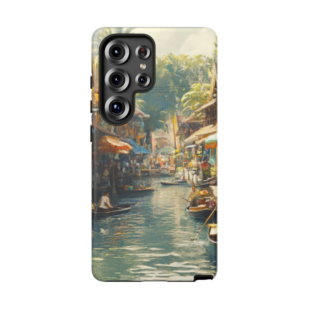 Dit telefoonhoesje toont een kleurrijke watermarkt waar boten rustig over een kanaal varen. Aan beide zijden van het kanaal staan houten kraampjes met grote oranje en witte parasols. De markt bruist van de activiteit: mensen roeien in boten en wandelen over houten steigers. Weelderige groene bomen en tropische planten omringen het geheel, met traditionele gebouwen met schuine daken op de achtergrond. Het hoesje heeft een dubbele laag van polycarbonaat en TPU voor extra stevigheid en bescherming buitenshuis, en is geschikt voor draadloos opladen.