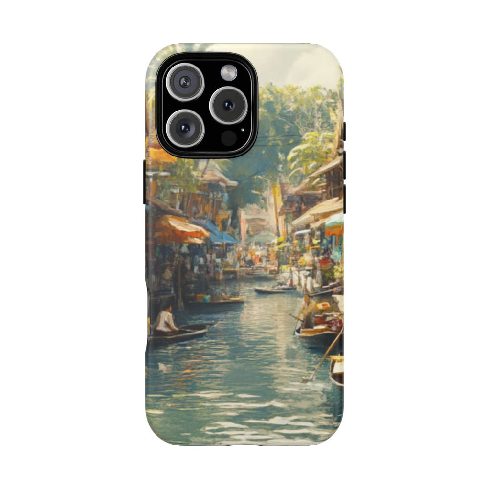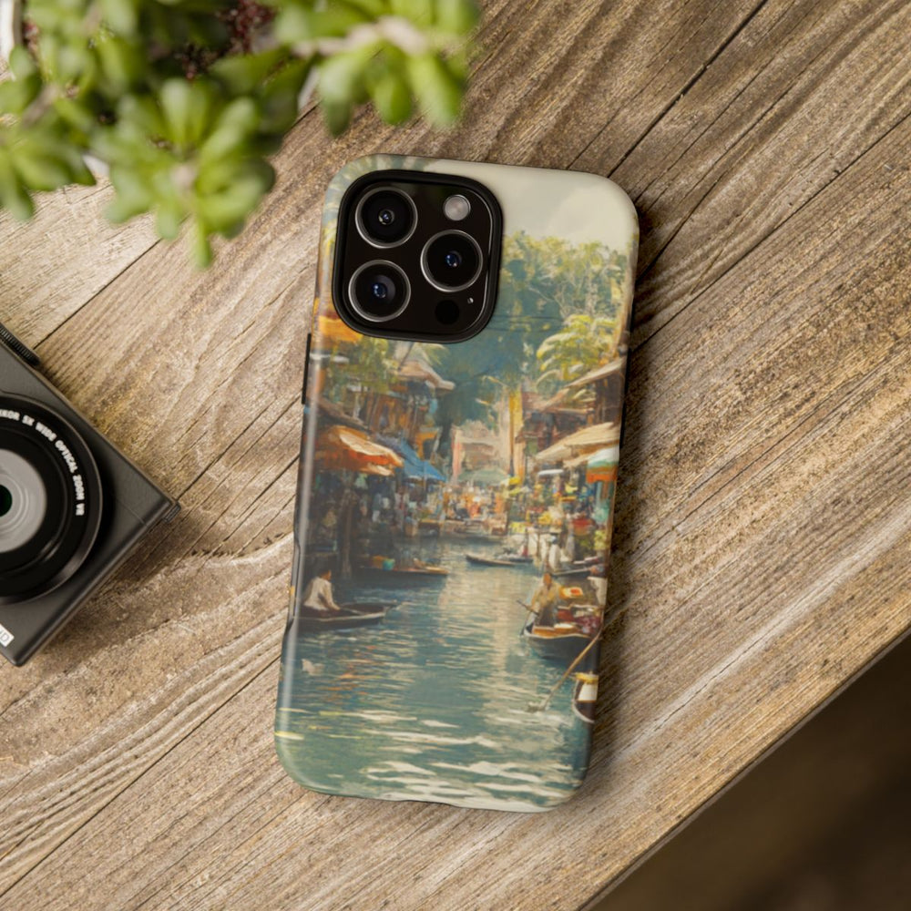 Dit hoesje toont een kleurrijke watermarkt met houten kramen en boten die rustig op een kanaal drijven. De markt bruist van het leven, met uiteenlopende producten uitgestald onder grote parasols, omringd door weelderig groene bomen en traditionele gebouwen. Het zonlicht weerspiegelt op het water en zorgt voor een sfeervolle en warme uitstraling. De afbeelding is bedrukt op een stevige, matte hoes met dubbele laag die geschikt is voor draadloos opladen.