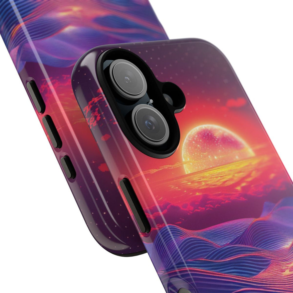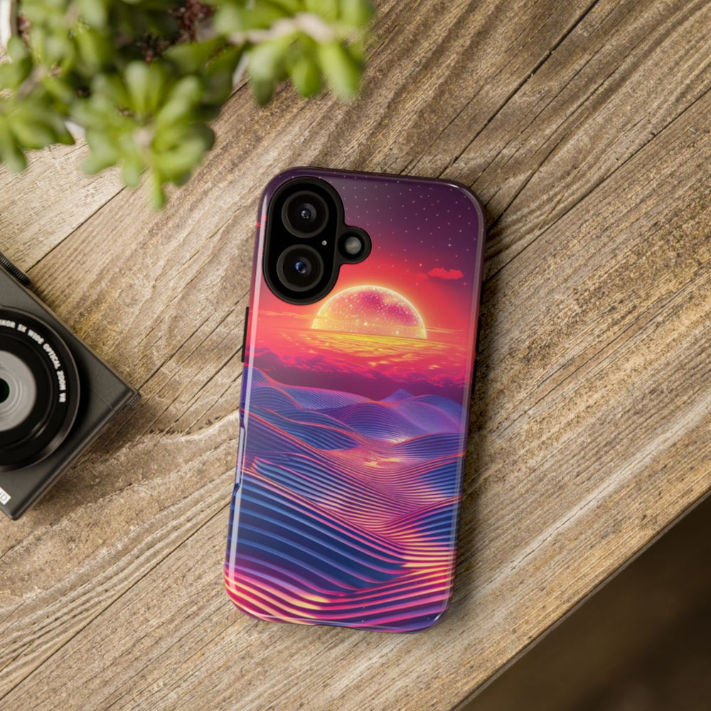 Dit telefoonhoesje toont een kleurrijke zonsondergang met een stralende zon die deels achter de wolken schuilgaat. Op de voorgrond zijn vloeiende, golvende vormen te zien met gestreepte patronen in blauwe en roze tinten, wat zorgt voor een dynamisch en futuristisch landschap. De donkere lucht is versierd met een raster van kleine witte stippen, wat een kosmische of digitale uitstraling geeft. Het hoesje heeft een dubbele laag van polycarbonaat en TPU voor extra bescherming en ondersteunt draadloos opladen.