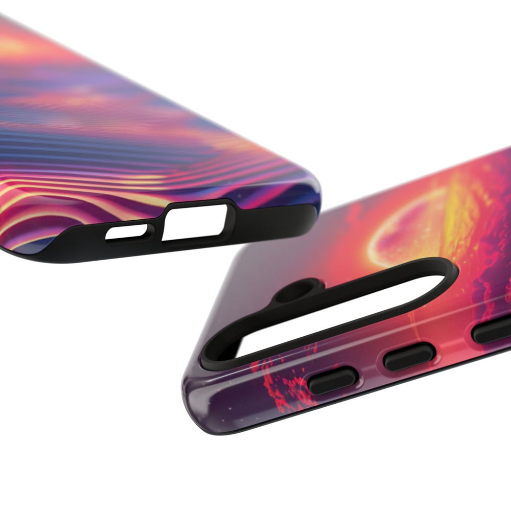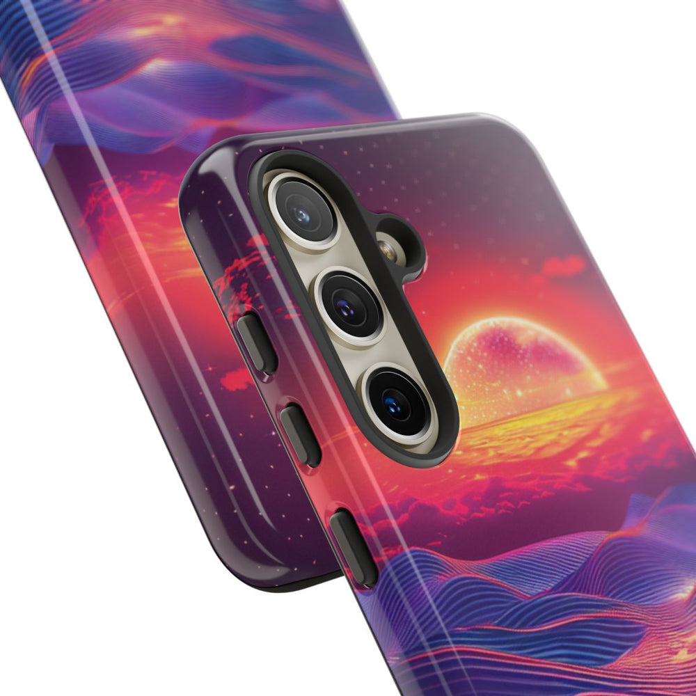 Dit telefoonhoesje toont een kleurrijke zonsondergang met een stralende zon die deels achter de wolken schuilgaat. Op de voorgrond zijn vloeiende, golvende vormen te zien met gestreepte patronen in blauwe en roze tinten, wat zorgt voor een dynamisch en futuristisch landschap. De donkere lucht is versierd met een raster van kleine witte stippen, wat een kosmische of digitale uitstraling geeft. Het hoesje heeft een dubbele laag van polycarbonaat en TPU voor extra bescherming en ondersteunt draadloos opladen.
