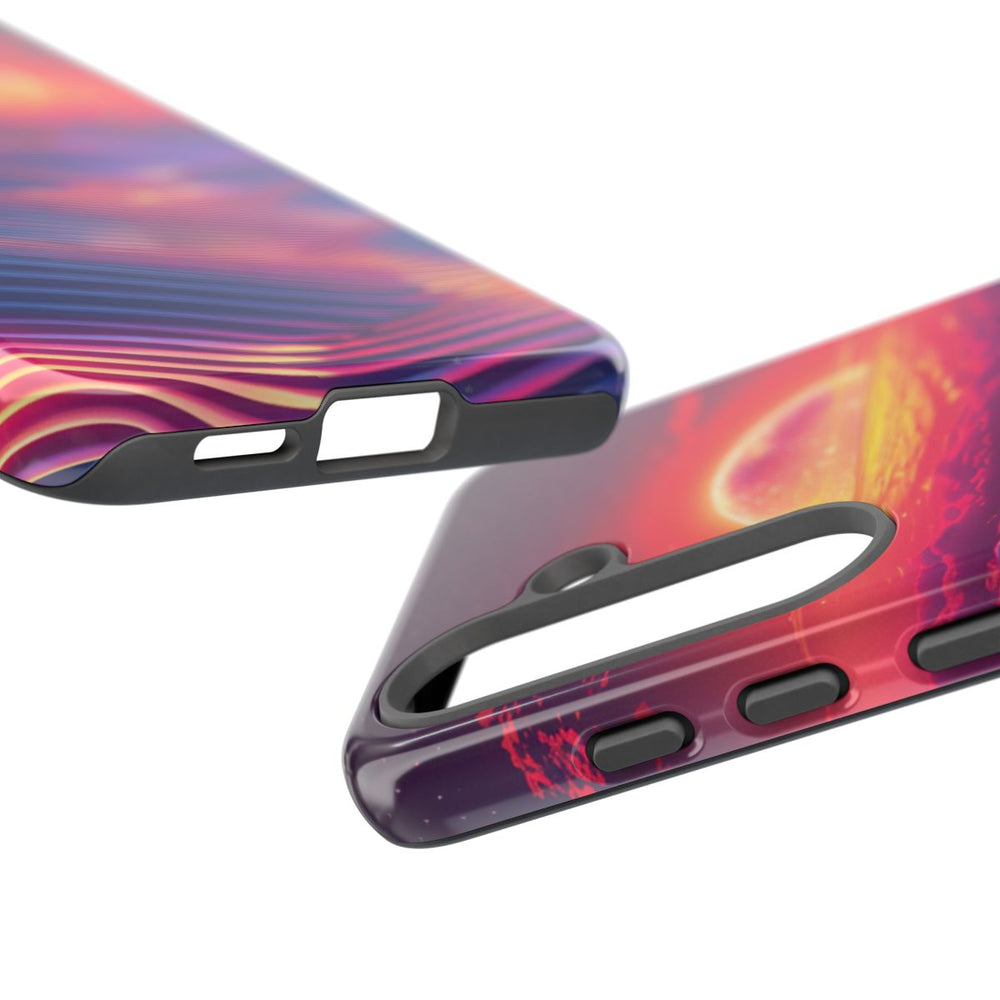 Dit telefoonhoesje toont een kleurrijke zonsondergang met een stralende zon die deels achter de wolken schuilgaat. Op de voorgrond zijn vloeiende, golvende vormen te zien met gestreepte patronen in blauwe en roze tinten, wat zorgt voor een dynamisch en futuristisch landschap. De donkere lucht is versierd met een raster van kleine witte stippen, wat een kosmische of digitale uitstraling geeft. Het hoesje heeft een dubbele laag van polycarbonaat en TPU voor extra bescherming en ondersteunt draadloos opladen.