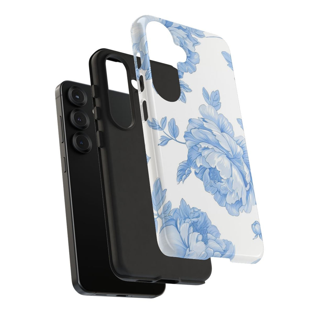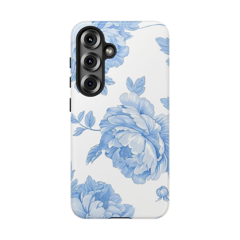 Dit hoesje is voorzien van een naadloos patroon met grote, gedetailleerde pioenrozen in lichtblauwe tinten op een witte achtergrond. De bloemen worden omringd door sierlijke bladeren en knoppen, wat zorgt voor een elegante en luchtige uitstraling. Het patroon is verfijnd uitgewerkt met fijne lijnen en schaduwen, wat het geheel een klassieke en stijlvolle look geeft. Het hoesje heeft een glanzende afwerking en bestaat uit een dubbele laag met een stevige polycarbonaat buitenkant en een TPU binnenzijde. Dit zorgt voor optimale bescherming en duurzaamheid. Bovendien ondersteunt het hoesje draadloos opladen.