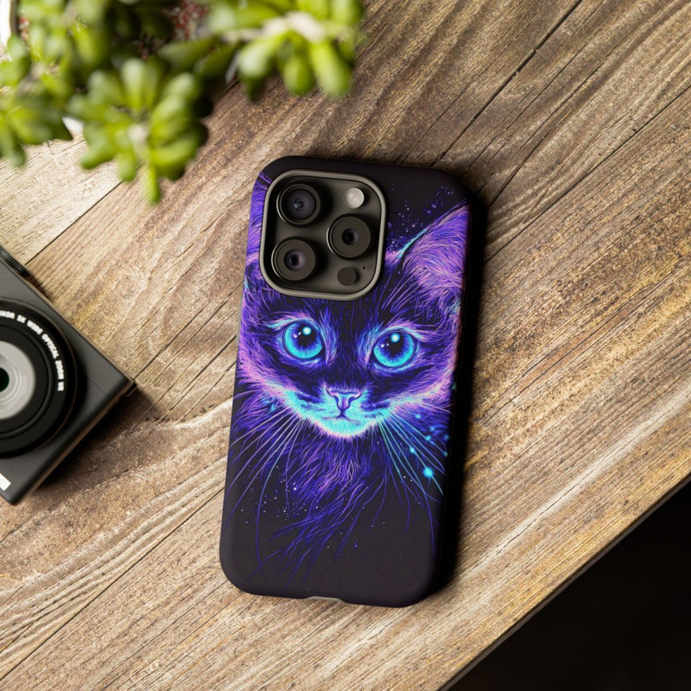 Dit ontwerp toont een schattige kattenkop met oplichtende turquoise ogen en levendige paarse en blauwe vacht. De snorharen van het katje glinsteren subtiel, terwijl lichte deeltjes rond de oren zweven en zo een magische sfeer creëren. De donkere achtergrond versterkt het dromerige effect van het geheel. Het hoesje is vervaardigd met een stevige dubbele laag van polycarbonaat en een TPU-binnenzijde, wat zorgt voor extra duurzaamheid en bescherming. Geschikt voor draadloos opladen.