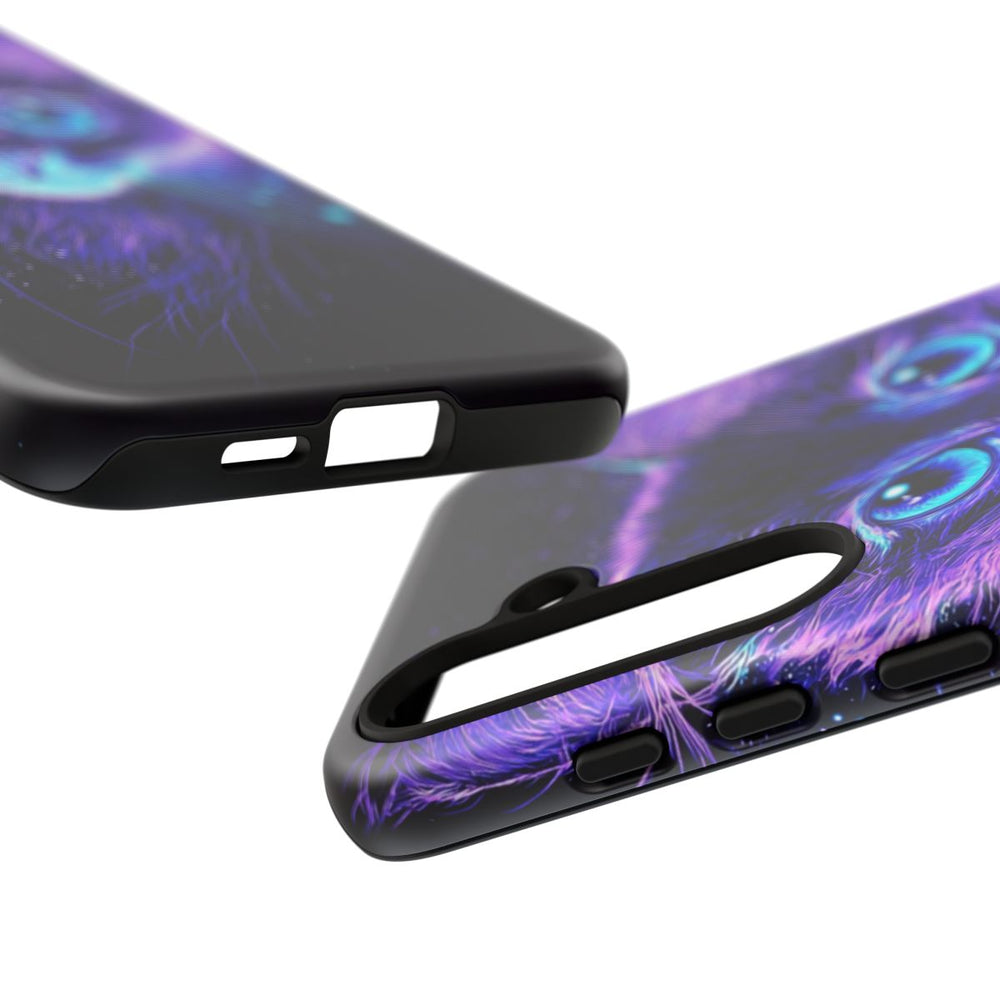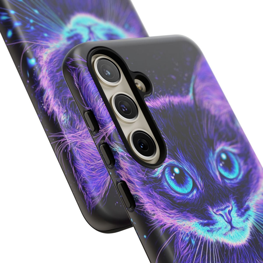Dit telefoonhoesje toont een schattige kittenkop met lichtgevende teal kleurige ogen en stralende snorharen. De vacht is afgebeeld in zachte, glinsterende violette en blauwe tinten voor een dromerige uitstraling. Lichtdeeltjes dansen rond de oren van het katje en versterken het magische effect. De donkere achtergrond laat de heldere kleuren extra opvallen. Dit matte, stevige hoesje is gemaakt van duurzame materialen en beschermt je toestel terwijl het dit betoverende ontwerp laat zien.