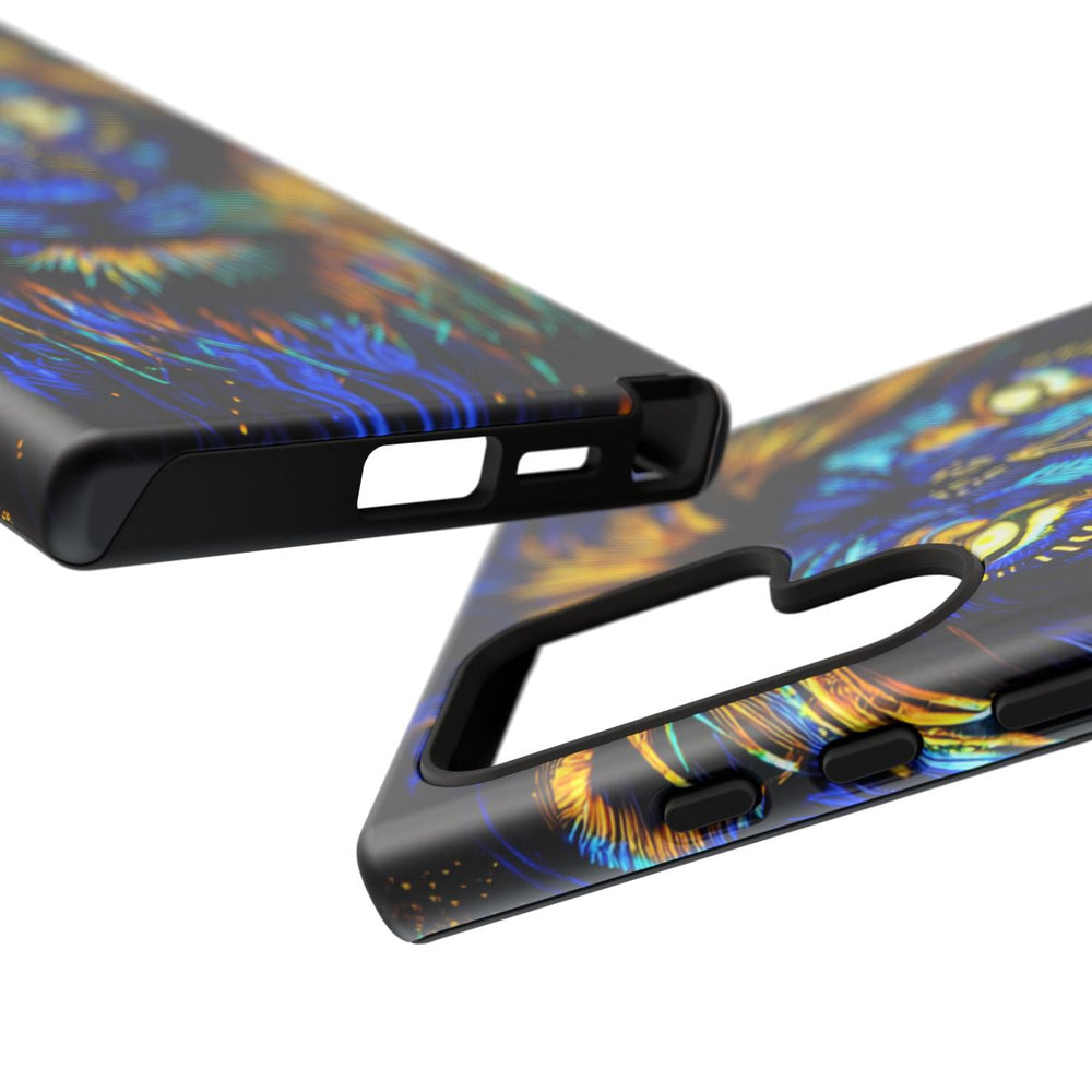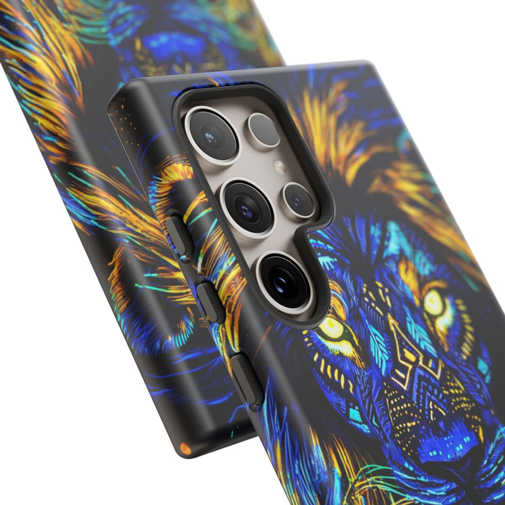 Dit telefoonhoesje toont een indrukwekkend portret van een leeuw, verlicht in levendige tinten blauw, goud en vurige oranje accenten. De manen zijn versierd met golvende, lichtgevende strengen, wat zorgt voor een majestueuze en mysterieuze uitstraling. Fijne tribale patronen zijn subtiel in de vacht verwerkt, terwijl zachte kosmische deeltjes diepte geven aan de achtergrond. Het matte, stevige hoesje is gemaakt van duurzame materialen en biedt optimale bescherming voor je toestel, terwijl het deze schitterende illustratie prachtig laat uitkomen.