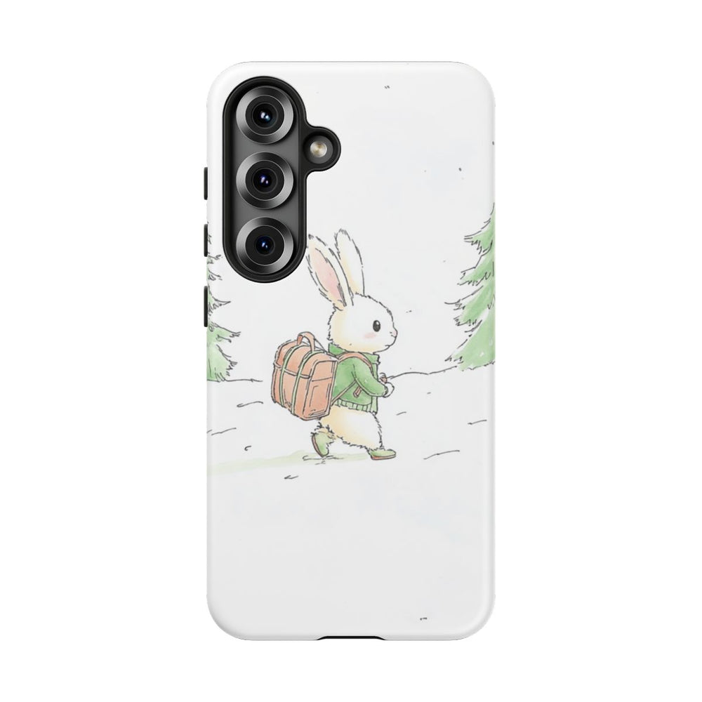 Dit hoesje toont een schattig wit konijntje dat door een besneeuwd landschap wandelt. Het konijntje draagt een groene trui en heeft een bruine rugzak op zijn rug. Rondom staan groene dennenbomen en een kale boom, allemaal tegen een overwegend witte achtergrond. De afbeelding heeft een zachte, handgetekende uitstraling met rustige kleuren. Het hoesje bestaat uit polycarbonaat en TPU en biedt dubbele bescherming. Geschikt voor draadloos opladen.