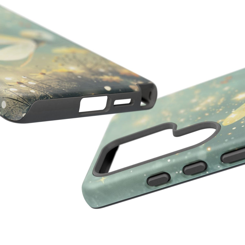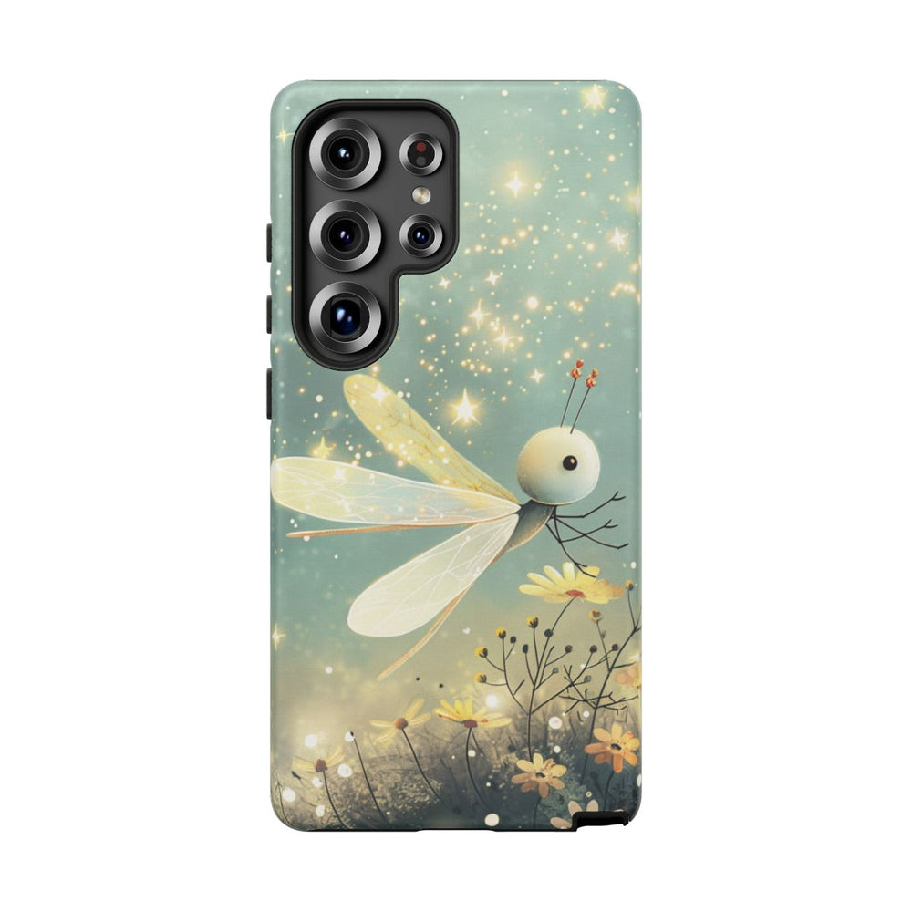 Dit ontwerp toont een schattige libelle met grote, sprekende ogen, omringd door fonkelende sterren op een zachte, pastelkleurige achtergrond. De libelle heeft fijne, doorschijnende vleugels en zit tussen speelse bloemen. De stijl doet denken aan illustraties uit kinderboeken en geeft een lichte, dromerige sfeer. Het hoesje is gemaakt van stevige materialen en beschermt je toestel, terwijl het deze charmante illustratie mooi laat uitkomen.