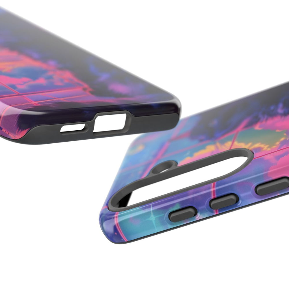 Dit ontwerp toont een zwarte kat die zittend omhoog kijkt tegen een betegelde muur. Op de muur is een levendige neonlucht te zien met wolken, sterren en een maan in tinten blauw, roze en paars. De tegels zijn voorzien van felroze rasterlijnen die de futuristische en vaporwave uitstraling versterken. Het hoesje heeft een glanzende afwerking, is gemaakt van polycarbonaat en TPU en biedt dubbele bescherming. Geschikt voor draadloos opladen.
