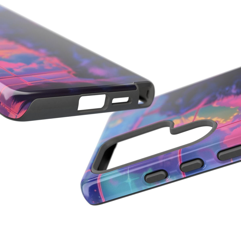 Dit ontwerp toont een zwarte kat die zittend omhoog kijkt tegen een betegelde muur. Op de muur is een levendige neonlucht te zien met wolken, sterren en een maan in tinten blauw, roze en paars. De tegels zijn voorzien van felroze rasterlijnen die de futuristische en vaporwave uitstraling versterken. Het hoesje heeft een glanzende afwerking, is gemaakt van polycarbonaat en TPU en biedt dubbele bescherming. Geschikt voor draadloos opladen.