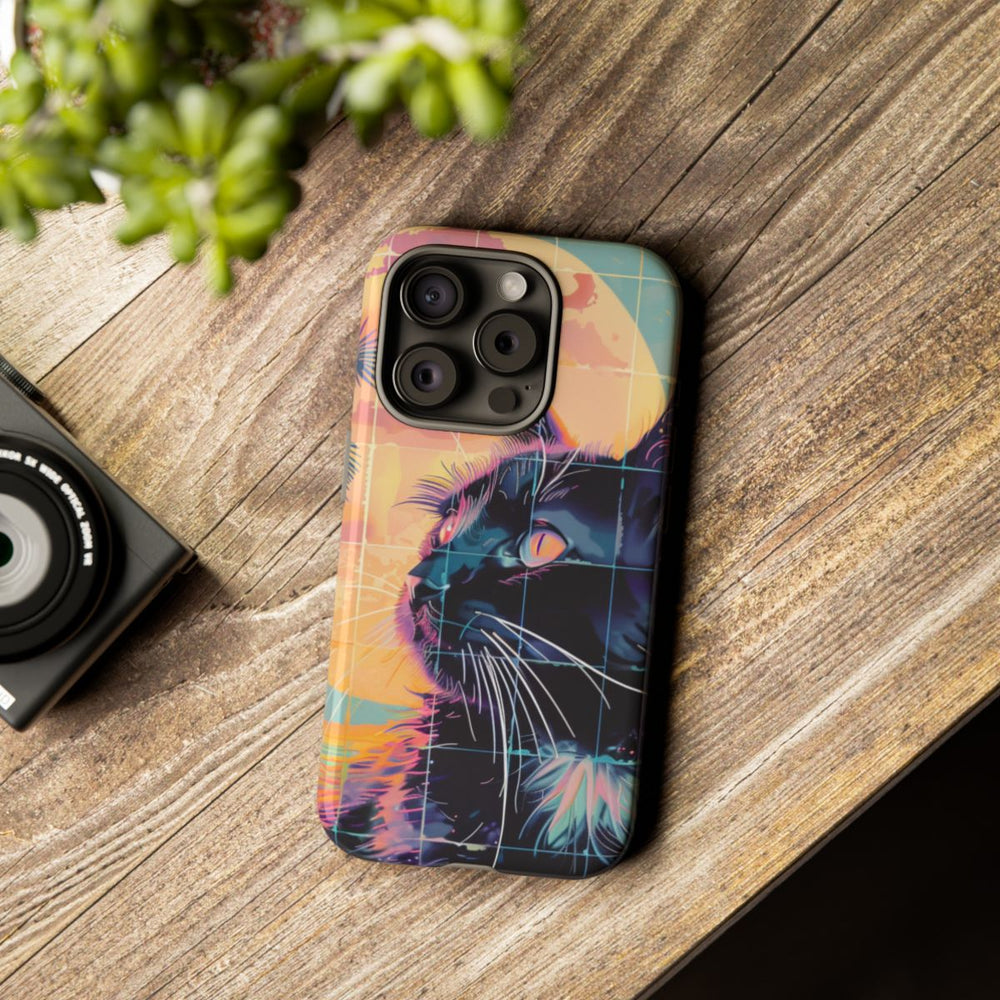 Dit hoesje heeft een stijlvol ontwerp met een zwarte kat met felgele ogen die omhoog kijkt, tegen een grote, stralende zonsondergang. Op de achtergrond zie je de silhouet van een palmboom en een rustige wateroppervlakte die de kleuren van de ondergaande zon weerspiegelt. De lucht is gevuld met zachte pastelwolken in roze, paarse en oranje tinten, wat zorgt voor een dromerige, vaporwave uitstraling. Het beeld is verdeeld in een rasterpatroon voor een tegelachtig effect. Dit glanzende, stevige hoesje is gemaakt van polycarbonaat en TPU en biedt extra bescherming en ondersteuning voor draadloos opladen.