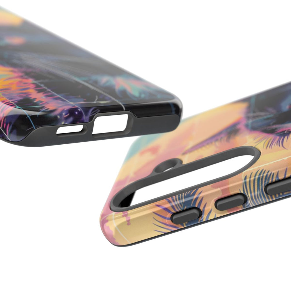 Dit hoesje heeft een stijlvol ontwerp met een zwarte kat met felgele ogen die omhoog kijkt, tegen een grote, stralende zonsondergang. Op de achtergrond zie je de silhouet van een palmboom en een rustige wateroppervlakte die de kleuren van de ondergaande zon weerspiegelt. De lucht is gevuld met zachte pastelwolken in roze, paarse en oranje tinten, wat zorgt voor een dromerige, vaporwave uitstraling. Het beeld is verdeeld in een rasterpatroon voor een tegelachtig effect. Dit glanzende, stevige hoesje is gemaakt van polycarbonaat en TPU en biedt extra bescherming en ondersteuning voor draadloos opladen.