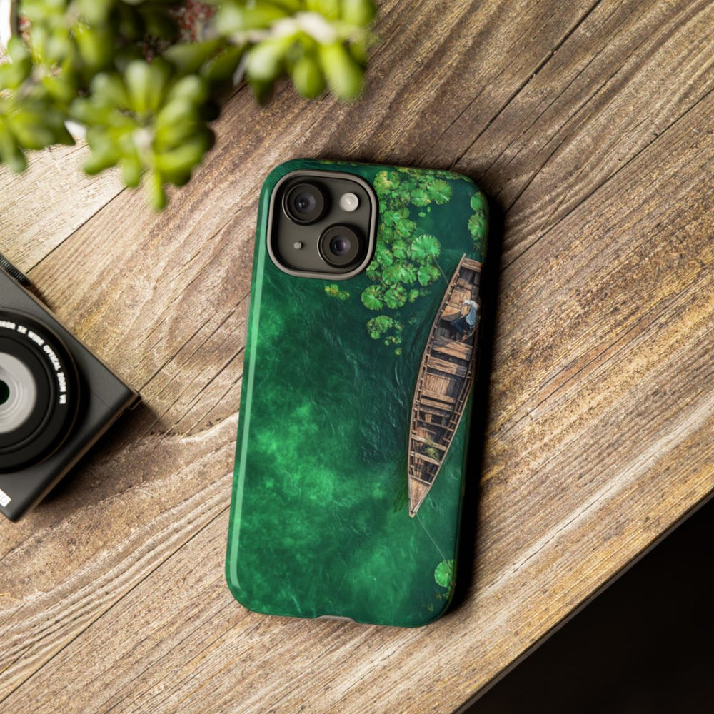 Dit hoesje toont een luchtfoto van een houten boot die drijft op helder groen water. In de boot zit een persoon die lijkt te vissen of bezig is met uitrusting. Rondom de boot liggen talloze groene lotusbladeren verspreid over het wateroppervlak. Het water heeft een diepe smaragdgroene kleur met zichtbare rimpelingen en texturen. Het ontwerp is bedrukt op een glanzend, stevig hoesje van polycarbonaat en TPU, dat bestaat uit twee lagen voor extra bescherming en draadloos opladen ondersteunt.