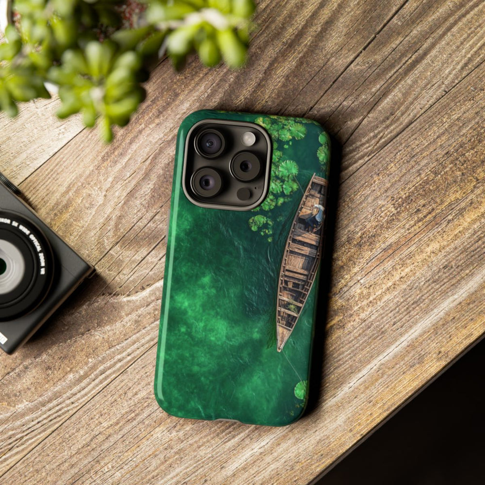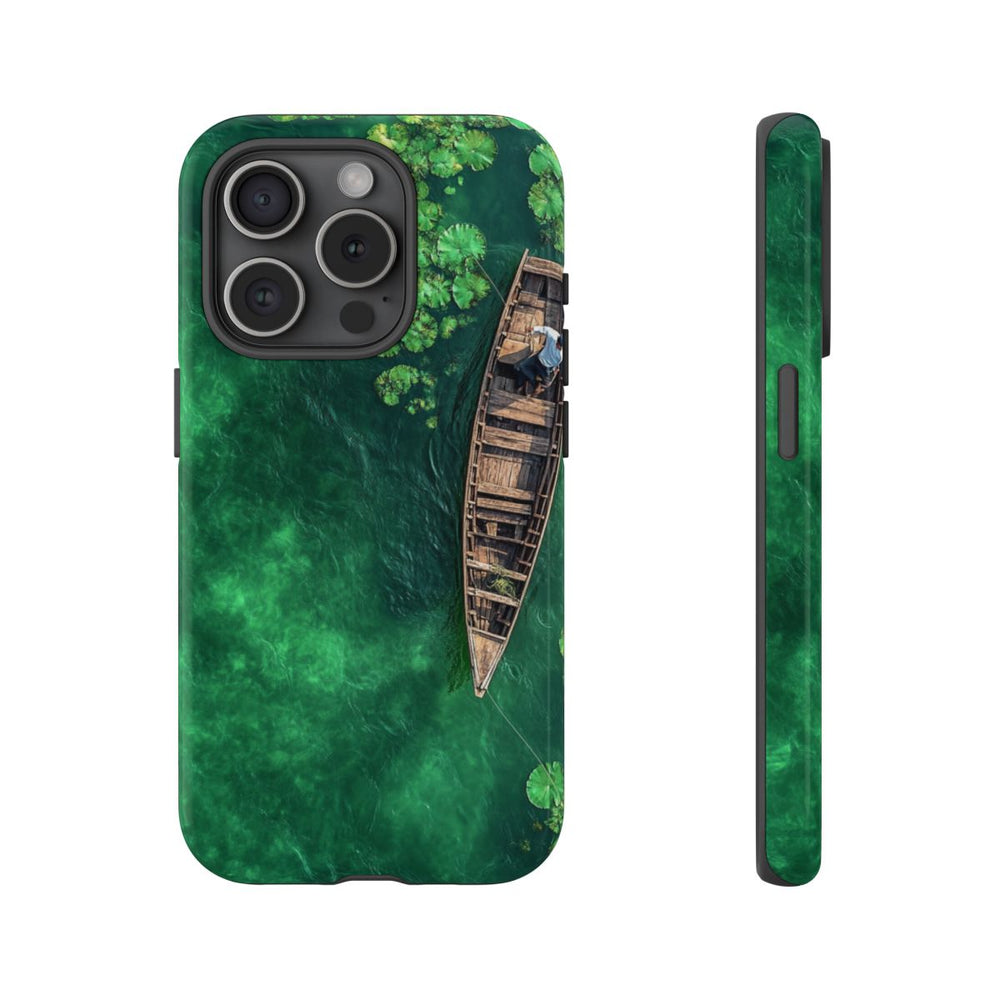 Dit hoesje toont een luchtfoto van een houten boot die drijft op helder groen water. In de boot zit een persoon die lijkt te vissen of bezig is met uitrusting. Rondom de boot liggen talloze groene lotusbladeren verspreid over het wateroppervlak. Het water heeft een diepe smaragdgroene kleur met zichtbare rimpelingen en texturen. Het ontwerp is bedrukt op een glanzend, stevig hoesje van polycarbonaat en TPU, dat bestaat uit twee lagen voor extra bescherming en draadloos opladen ondersteunt.