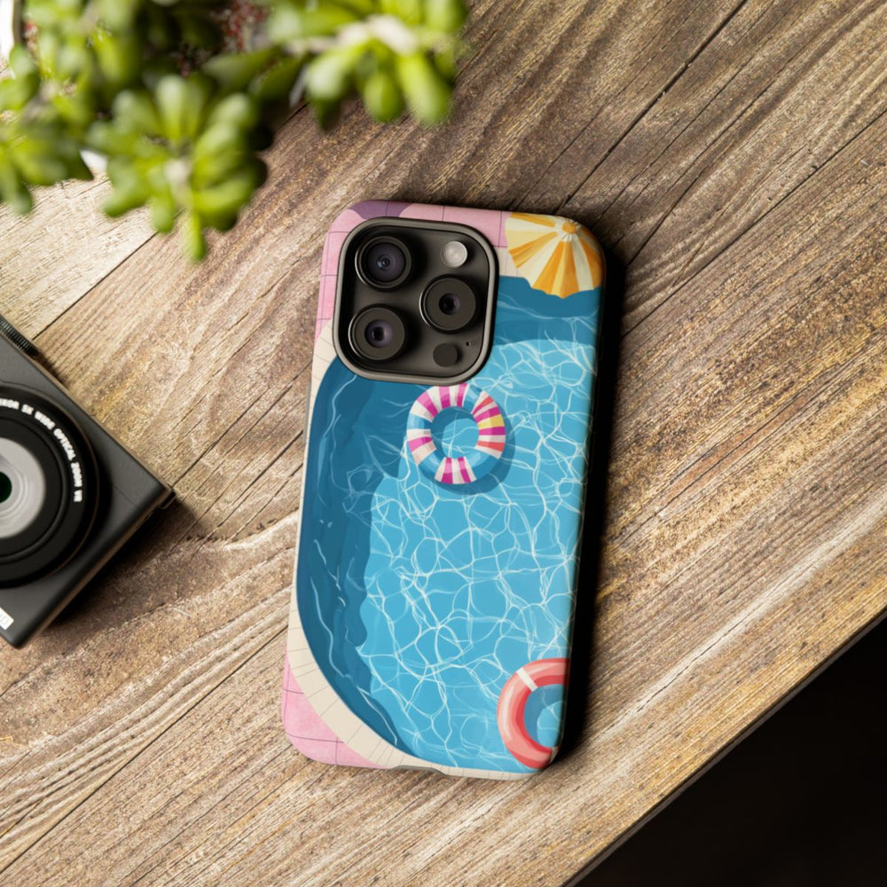 Dit hoesje toont een luchtfoto van een zwembad met helderblauw water en zichtbare lichtreflecties. Het zwembad is omrand met crèmekleurige tegels en ligt in een omgeving van roze vloertegels. Twee kleurrijke opblaasringen, één gestreept en één effen rood met witte accenten, drijven op het water. Op de roze tegels werpt een geel met wit gestreepte strandparasol een schaduw. Dit stevige, matte hoesje heeft een dubbele laag van polycarbonaat en TPU en is geschikt voor draadloos opladen.