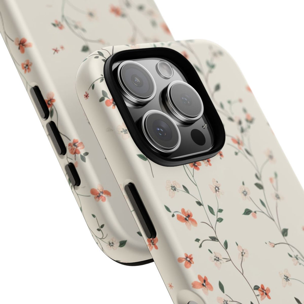Dit hoesje heeft een verfijnd bloemenpatroon met kleine bloemetjes verspreid over een effen, lichtbeige achtergrond. De bloemen zijn uitgevoerd in zachte tinten koraal en lichtroze, met groene blaadjes en sierlijk slingerende stelen. Het ontwerp straalt een romantische, natuurlijke sfeer uit en oogt licht en luchtig. Het matte hoesje is stevig dankzij de dubbele laag en biedt optimale bescherming. Geschikt voor draadloos opladen en bestand tegen weersinvloeden.