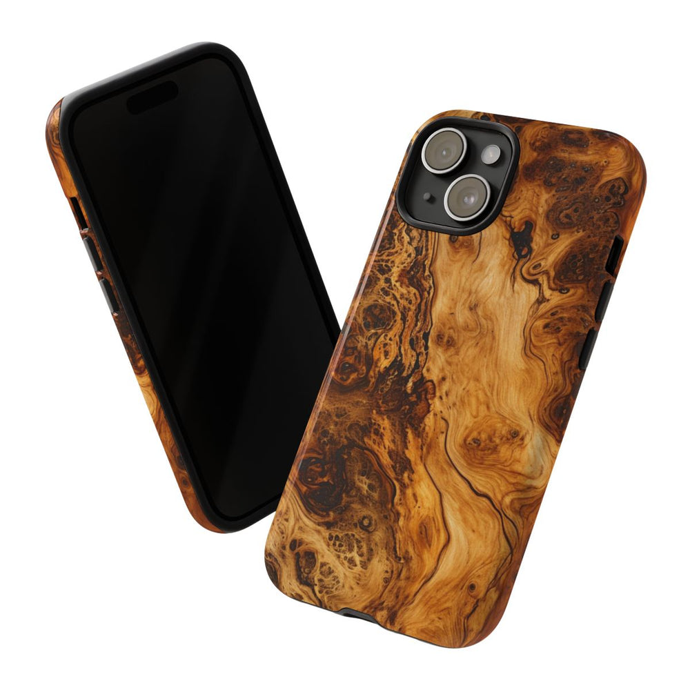 Dit ontwerp laat een gedetailleerde close-up zien van een luxe burlhoutstructuur met rijke, golvende patronen in diverse bruintinten. De verfijnde houtnerf zorgt voor een natuurlijke en elegante uitstraling, waarbij donkere knoesten en lichtere houttinten naadloos in elkaar overlopen. Het glanzende, stevige hoesje is gemaakt van een dubbele laag met een polycarbonaat buitenkant en een TPU-binnenzijde voor extra stevigheid. Het hoesje ondersteunt draadloos opladen, is bestand tegen weersinvloeden en behoudt zijn heldere uitstraling.