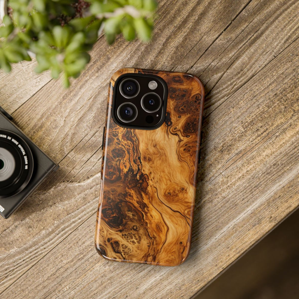 Dit ontwerp laat een gedetailleerde close-up zien van een luxe burlhoutstructuur met rijke, golvende patronen in diverse bruintinten. De verfijnde houtnerf zorgt voor een natuurlijke en elegante uitstraling, waarbij donkere knoesten en lichtere houttinten naadloos in elkaar overlopen. Het glanzende, stevige hoesje is gemaakt van een dubbele laag met een polycarbonaat buitenkant en een TPU-binnenzijde voor extra stevigheid. Het hoesje ondersteunt draadloos opladen, is bestand tegen weersinvloeden en behoudt zijn heldere uitstraling.