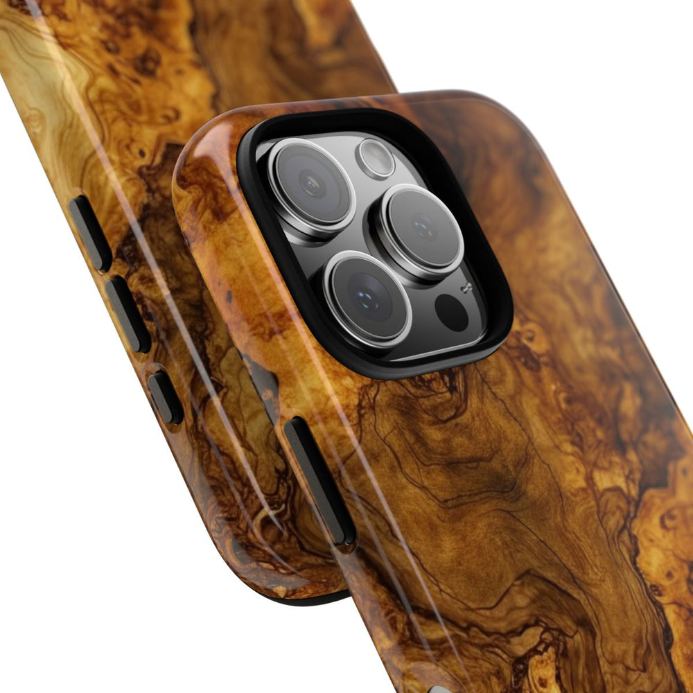 Dit telefoonhoesje heeft een verfijnde burlhoutstructuur met sierlijke patronen en warme, natuurlijke tinten. De afbeelding laat een vloeiende mix zien van lichte en donkere bruinaccenten, waardoor een elegante en luxe houtnerf ontstaat. Het glanzende hoesje is stevig uitgevoerd met een dubbele laag: een harde polycarbonaat buitenkant en een TPU-binnenzijde voor extra bescherming en duurzaamheid. Geschikt voor draadloos opladen en bestand tegen weersinvloeden, zodat de uitstraling langdurig mooi blijft.