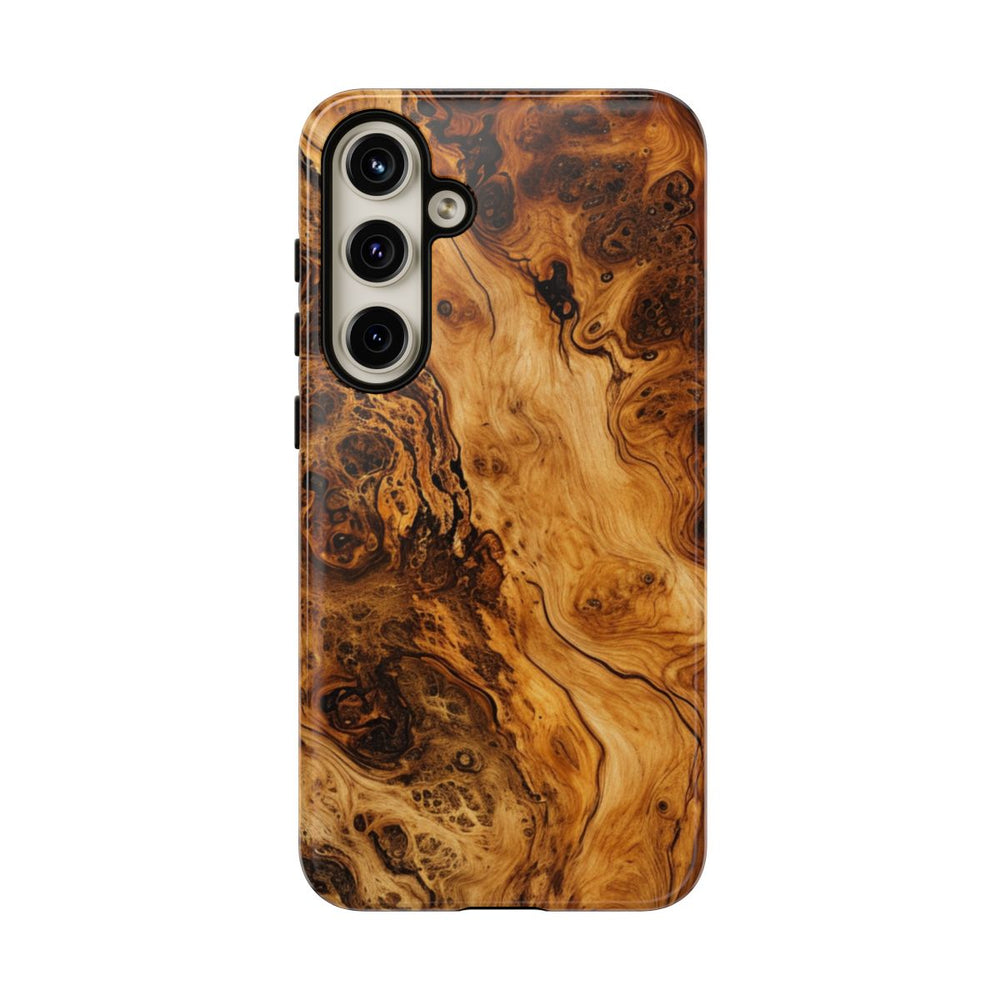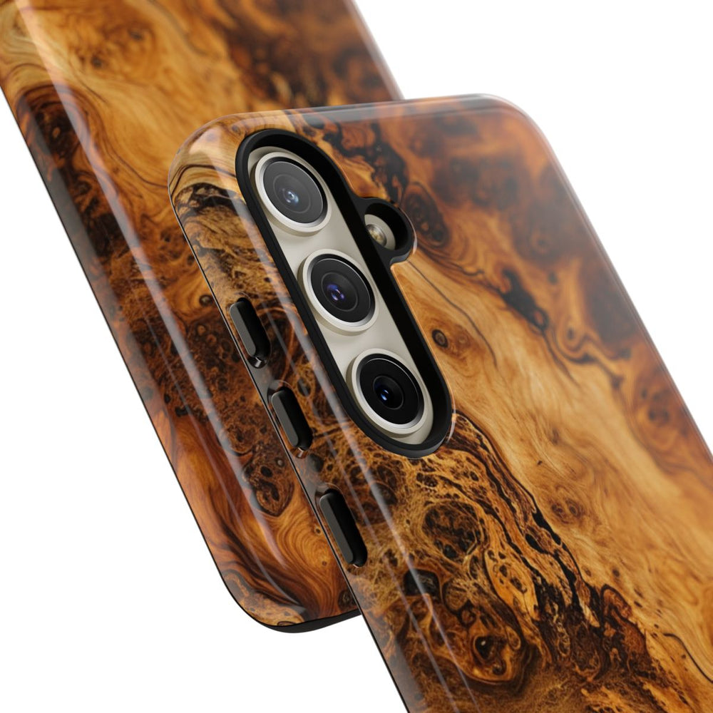 Dit ontwerp laat een gedetailleerde close-up zien van een luxe burlhoutstructuur met rijke, golvende patronen in diverse bruintinten. De verfijnde houtnerf zorgt voor een natuurlijke en elegante uitstraling, waarbij donkere knoesten en lichtere houttinten naadloos in elkaar overlopen. Het glanzende, stevige hoesje is gemaakt van een dubbele laag met een polycarbonaat buitenkant en een TPU-binnenzijde voor extra stevigheid. Het hoesje ondersteunt draadloos opladen, is bestand tegen weersinvloeden en behoudt zijn heldere uitstraling.