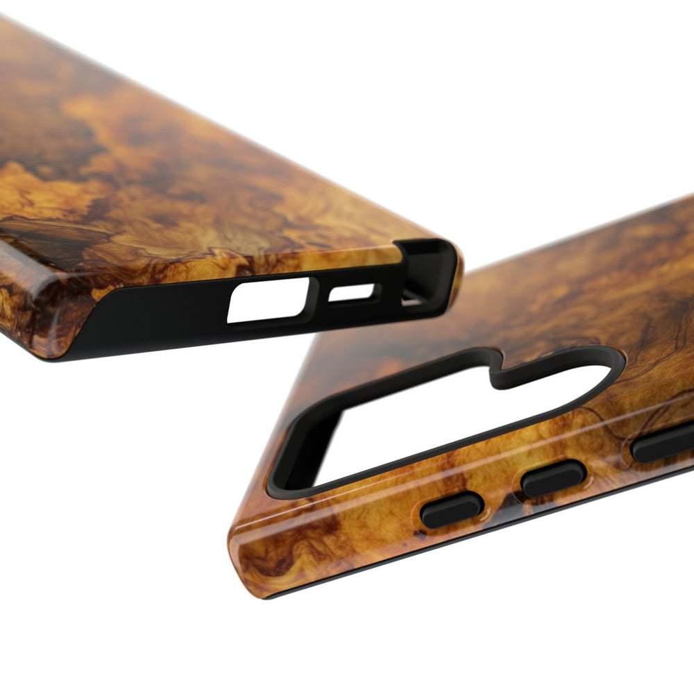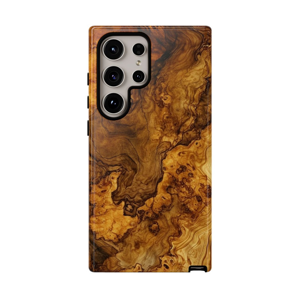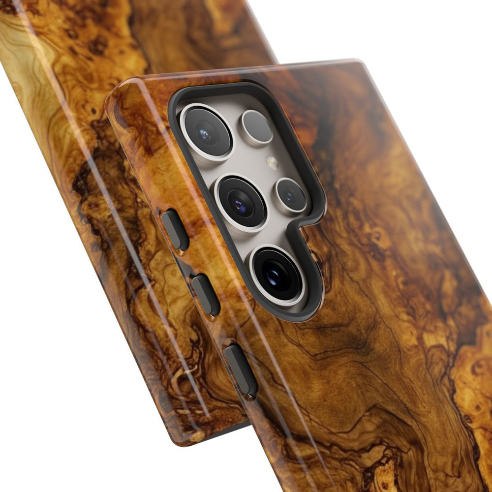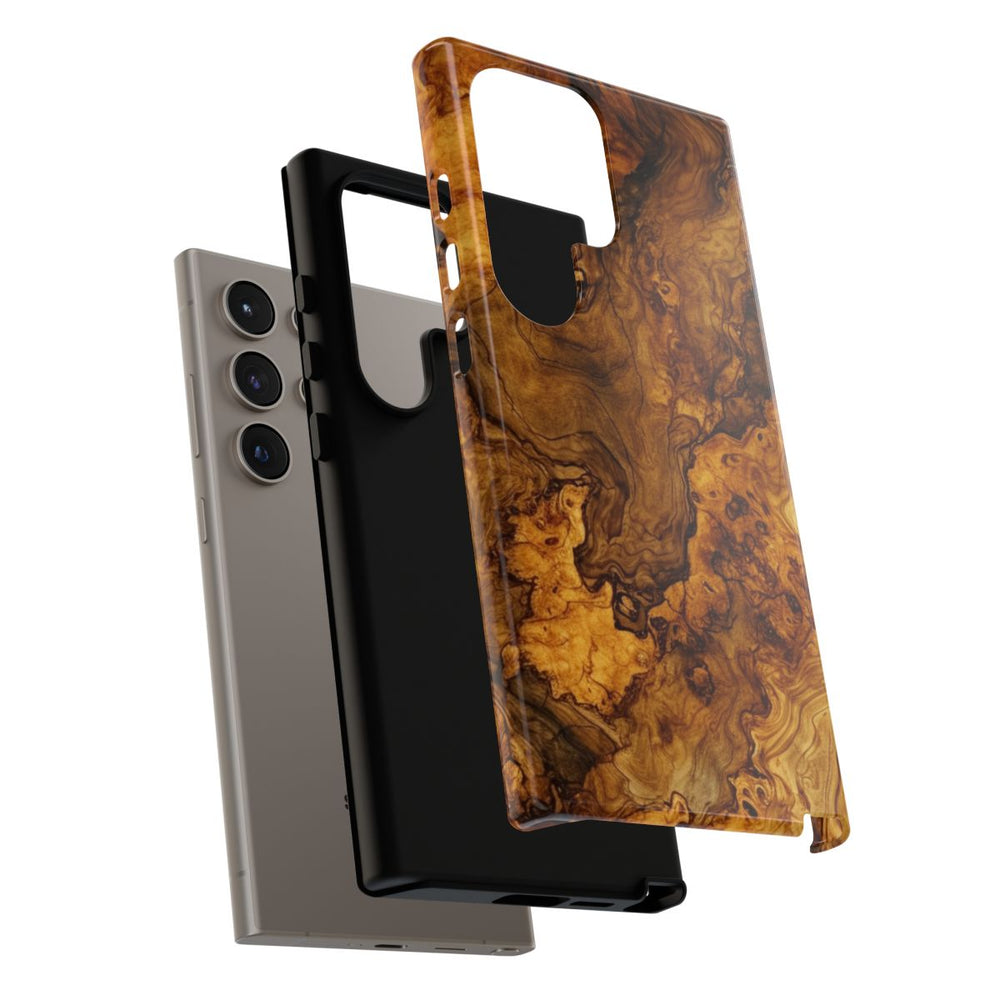 Dit telefoonhoesje heeft een verfijnde burlhoutstructuur met sierlijke patronen en warme, natuurlijke tinten. De afbeelding laat een vloeiende mix zien van lichte en donkere bruinaccenten, waardoor een elegante en luxe houtnerf ontstaat. Het glanzende hoesje is stevig uitgevoerd met een dubbele laag: een harde polycarbonaat buitenkant en een TPU-binnenzijde voor extra bescherming en duurzaamheid. Geschikt voor draadloos opladen en bestand tegen weersinvloeden, zodat de uitstraling langdurig mooi blijft.