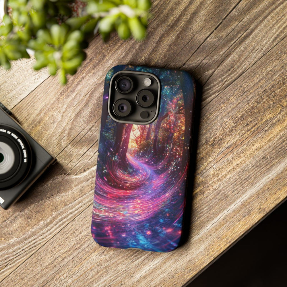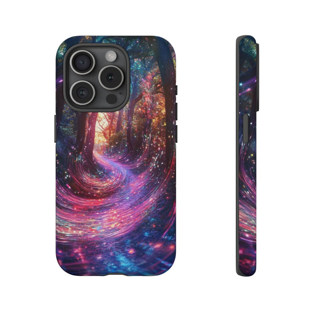 Dit hoesje heeft een betoverend ontwerp van een mystiek bospad, omringd door hoge bomen met donkere stammen en kleurrijk bladerdek. Zwierige energiegolven in levendige roze, blauwe en paarse tinten geven het geheel een magisch en dynamisch effect. Op de achtergrond zorgt een stralende lichtbron voor extra warmte en diepte. Het hoesje is voorzien van een stevige polycarbonaat buitenkant en een TPU-binnenlaag, voor optimale bescherming en geschikt voor draadloos opladen.