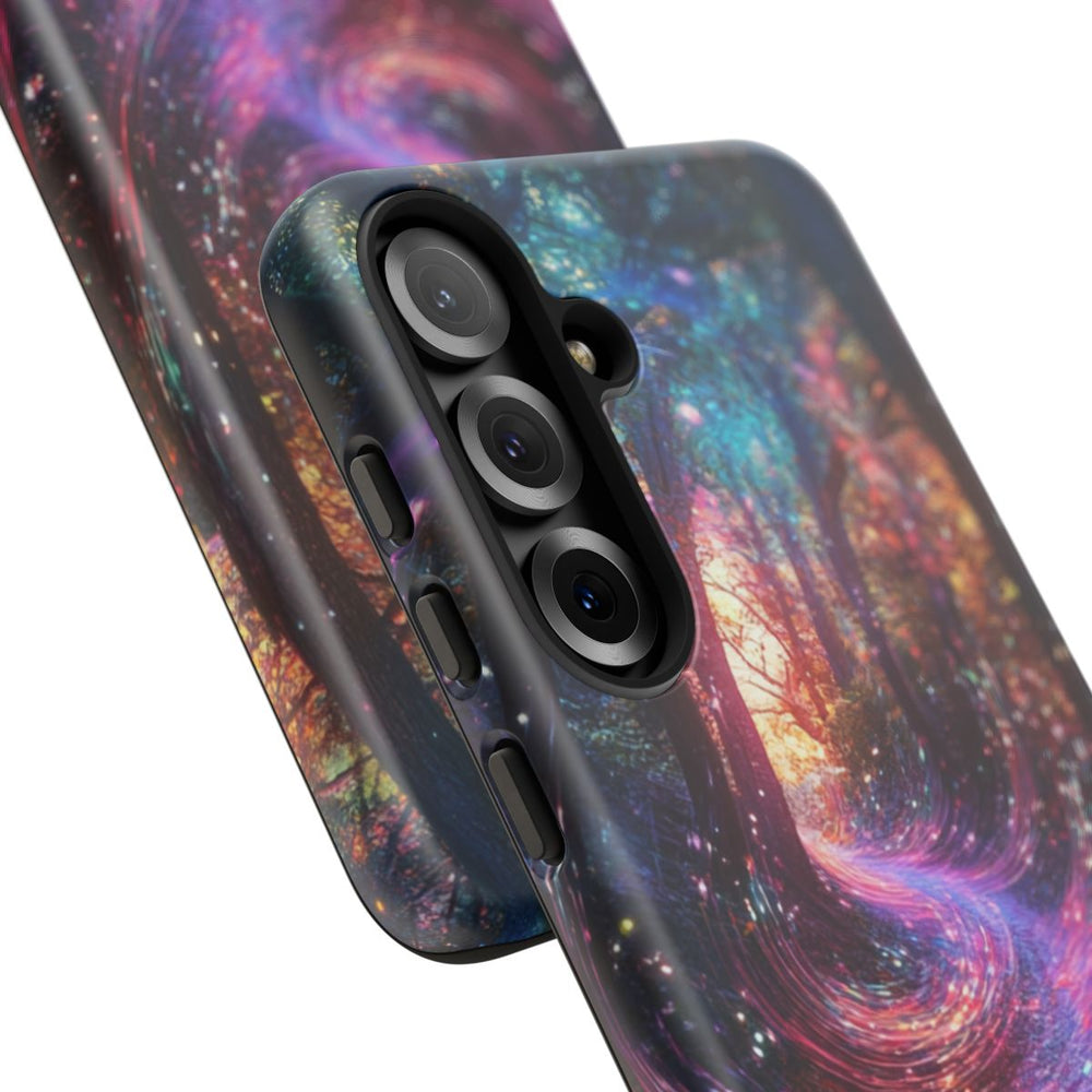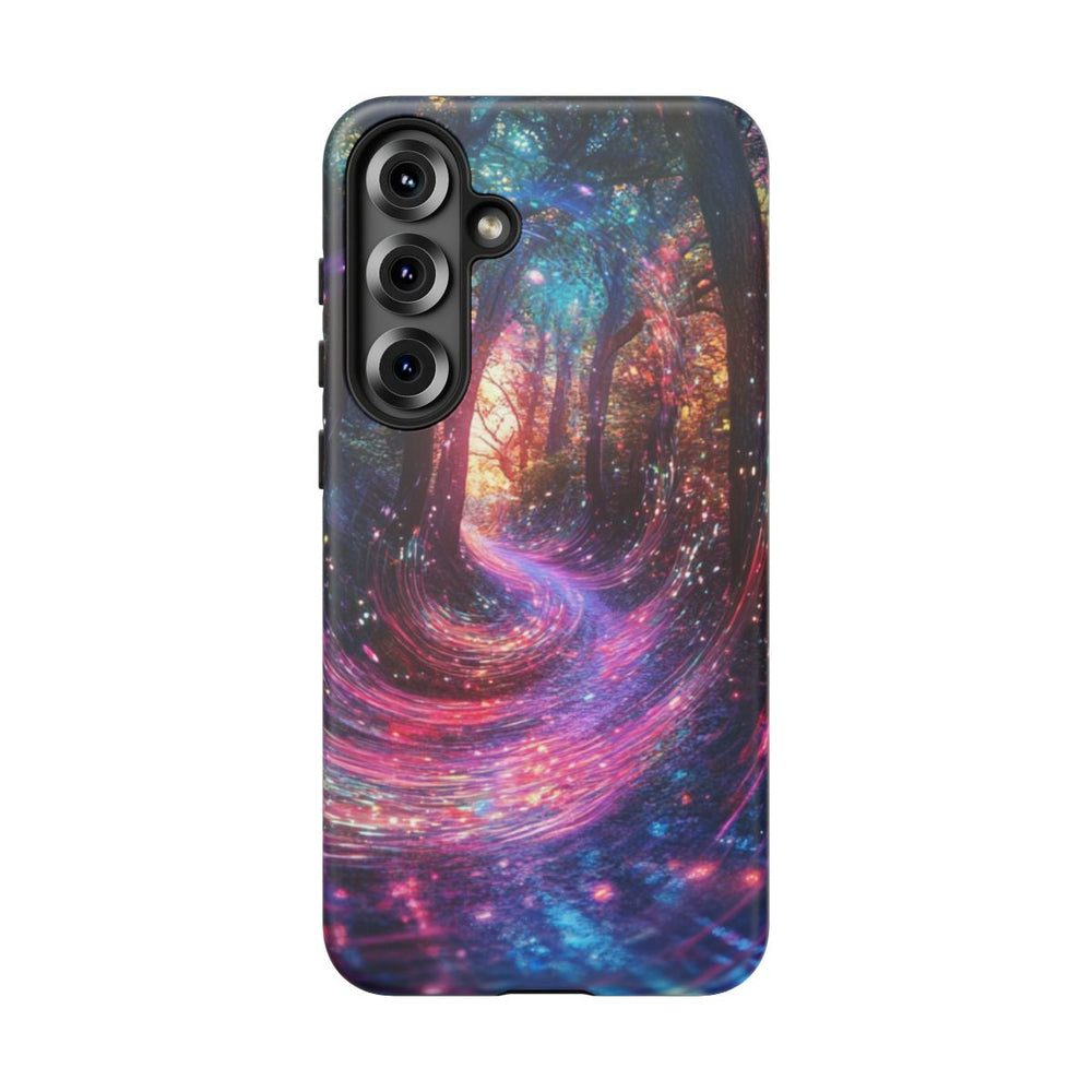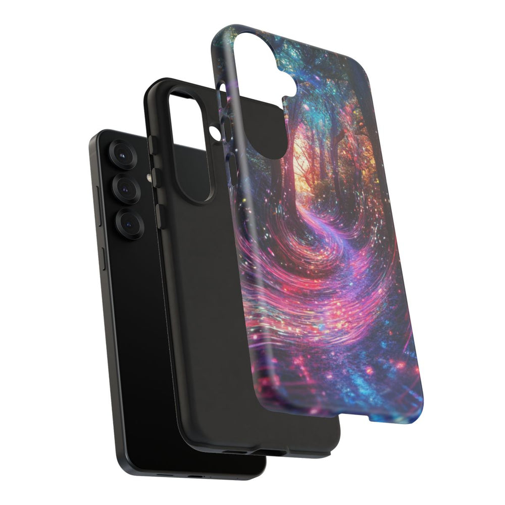 Dit telefoonhoesje toont een sfeervol bospad omringd door hoge bomen met dicht bladerdak. Langs het pad en tussen de bomen kronkelen kleurrijke energiegolven in tinten roze, blauw en paars. Op de achtergrond zorgt een heldere lichtbron voor een warme gloed in het bos. Het stevige, matte hoesje bestaat uit twee lagen van polycarbonaat en TPU voor extra bescherming en is geschikt voor draadloos opladen.