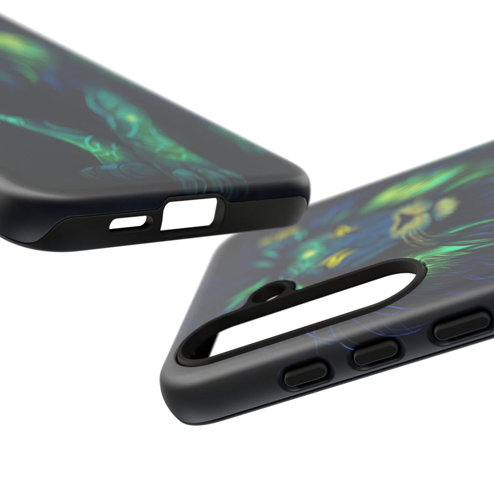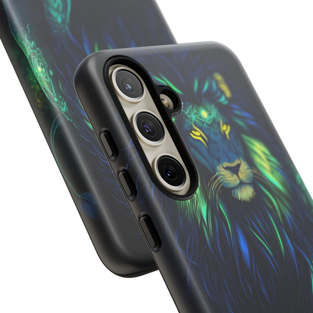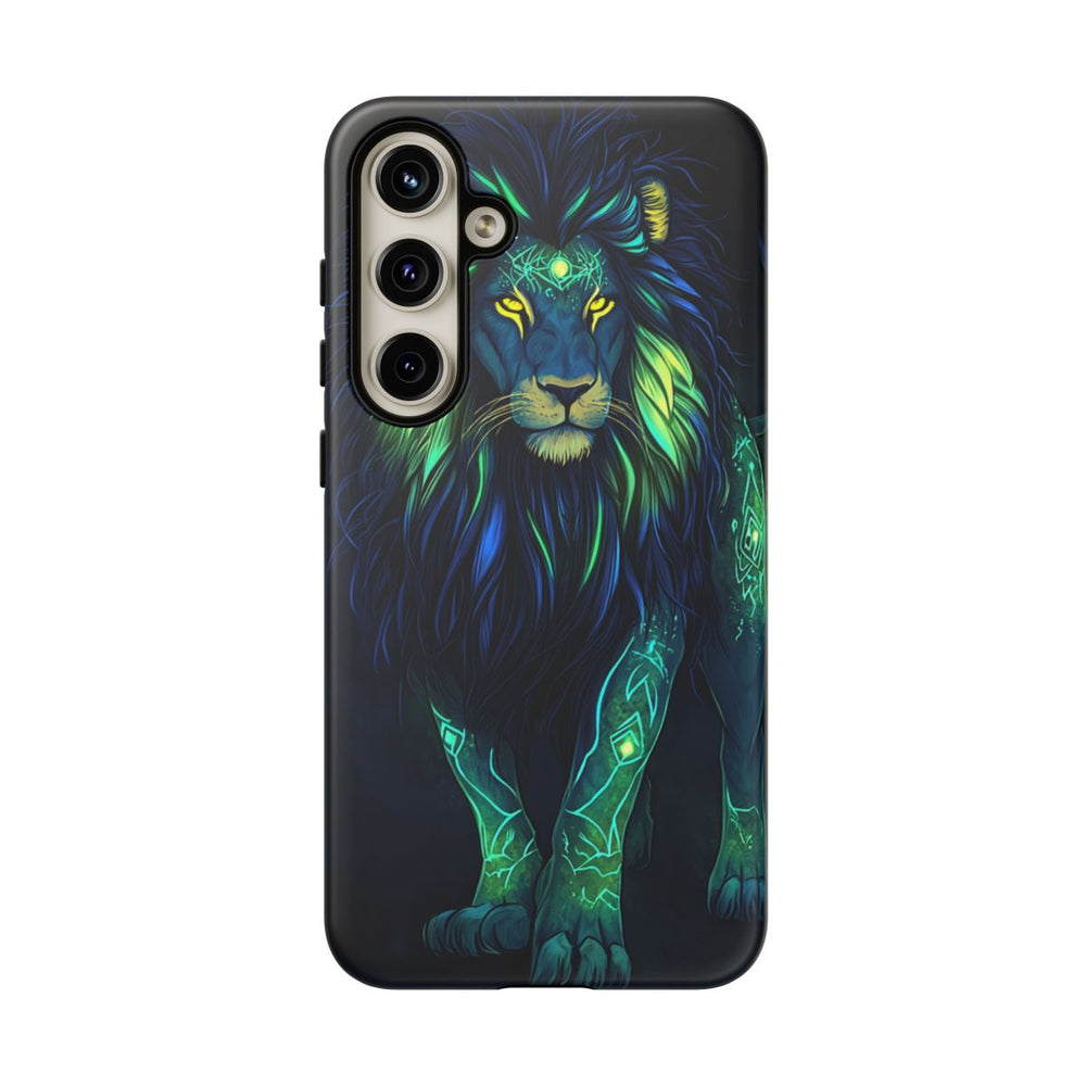 Dit telefoonhoesje toont een indrukwekkende afbeelding van een krachtige leeuw met lichtgevende manen in levendige tinten elektrisch blauw en neongroen. De leeuw staat trots afgebeeld tegen een donkere achtergrond, met felle gouden ogen en oplichtende tribale patronen op het voorhoofd. Het ontwerp straalt kracht en wijsheid uit en is daarmee een echte blikvanger voor liefhebbers van dierenkunst. Het stevige hoesje is gemaakt van 100% polycarbonaat met een binnenzijde van 100% TPU en biedt optimale bescherming voor je toestel.