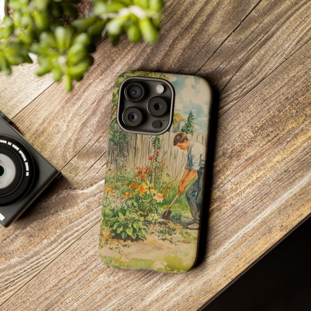 Op dit hoesje staat een man afgebeeld die aan het graven is in een tuin vol kleurrijke bloemen en groen. Hij draagt een lichtblauw shirt en een blauwe broek. De tuin wordt omringd door een hoge houten schutting en op de achtergrond zijn een boom en een klein gebouwtje met een rood dak te zien. De lucht is deels bewolkt met blauwe en witte tinten. Het ontwerp is gedrukt op een mat, stevig telefoonhoesje dat perfect past om het genoemde toestel.