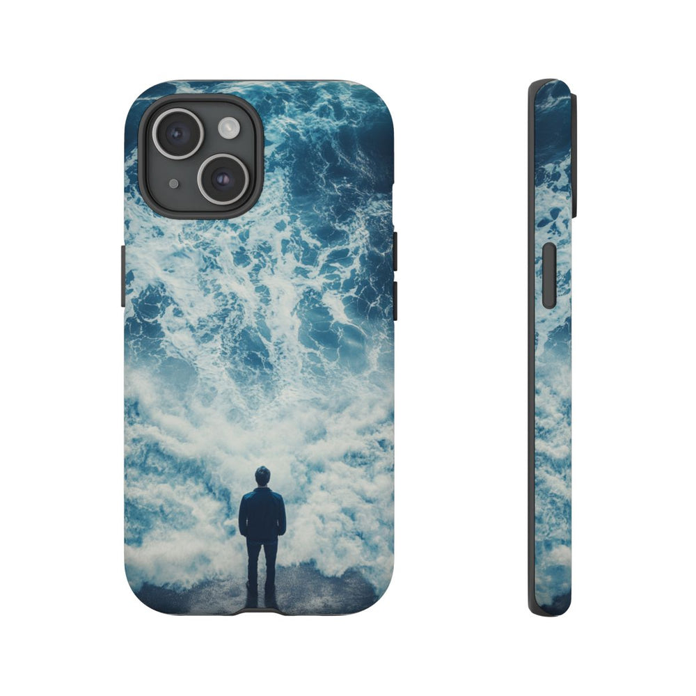 Dit telefoonhoesje toont een persoon die op een donkere ondergrond staat en uitkijkt over een onstuimige oceaan. De golven zijn schuimend en wit, wat mooi afsteekt tegen het diepe blauw van het water. De persoon is van achteren te zien, gekleed in donkere kleding en werpt een schaduw op de grond. Deze afbeelding vangt de krachtige en dynamische beweging van de zee. Het matte, stevige hoesje is gemaakt van polycarbonaat en TPU, en biedt uitstekende bescherming en duurzaamheid, ook buitenshuis. Ondersteunt draadloos opladen.